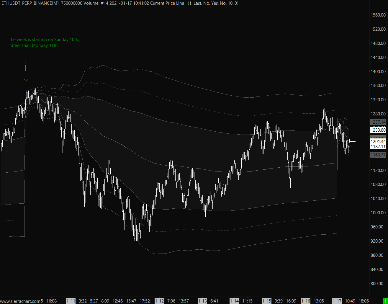 Hi, I am trying to use the built in Volume Weighted Average Price study. I have tried using both a 7 day period and a 1 week period, both give the same problem. They are starting the new week on Sundays, rather than Monday. Here is a screenshot of my chart showing the problem: http://www.sierrachart.com/image.php?Image=1610880063136.png I believe the issue may be something to do with the fact I am looking at a 24/7 traded market (specifically, ETHUSDT_PERP_BINANCE), so perhaps the study isn't designed to account for full 7 day weeks like this. Date Time Of Last Edit: 2021-01-17 15:45:30