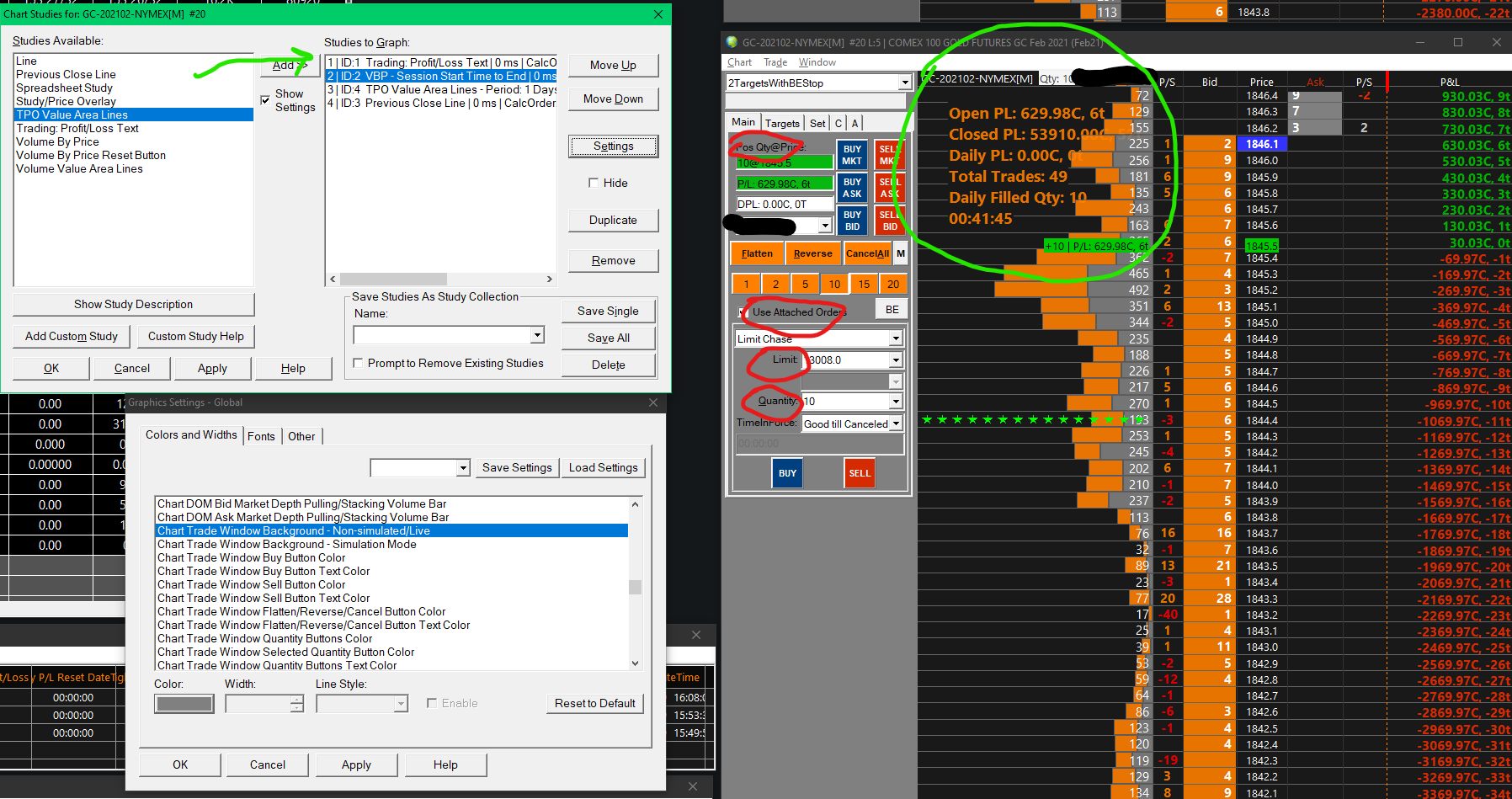 See attached image of my DOM setup for illustration. 1 - I've spent an embarrassing number of amount of hours trying to get the study Trading:Profit/Loss Text to show on top of the VBP study with no luck. As an example I can Move Up or Move Down <Study #3 TPO Value Area Lines> and it will show above or below VBP, but not Trading:Profit. I've also messed with lots of settings like; Draw Study Underneath Main Price Graph, Changing chart regions etc. 2 - Can you change the text color that is circled in red? I can't find the setting... Thanks! |