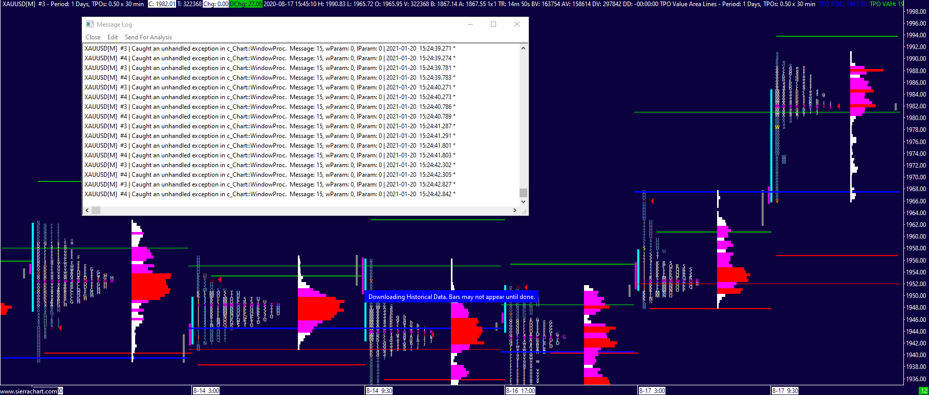 Therefore, there must be something wrong with your ssystem most likely. Try updating Sierra Chart to the latest version and see if that helps: Software Download: Fast Update If you still have an issue, create a new Chartbook and do not use your existing Chartbook. Maybe there is something about a particular configuration which is triggering the problem. So best to start with a simple chart set up. And the next step would be to try a different computer. Sierra Chart Support - Engineering Level Your definitive source for support. Other responses are from users. Try to keep your questions brief and to the point. Be aware of support policy: https://www.sierrachart.com/index.php?l=PostingInformation.php#GeneralInformation For the most reliable, advanced, and zero cost futures order routing, *change* to the Teton service: Sierra Chart Teton Futures Order Routing Date Time Of Last Edit: 2021-01-21 02:55:41