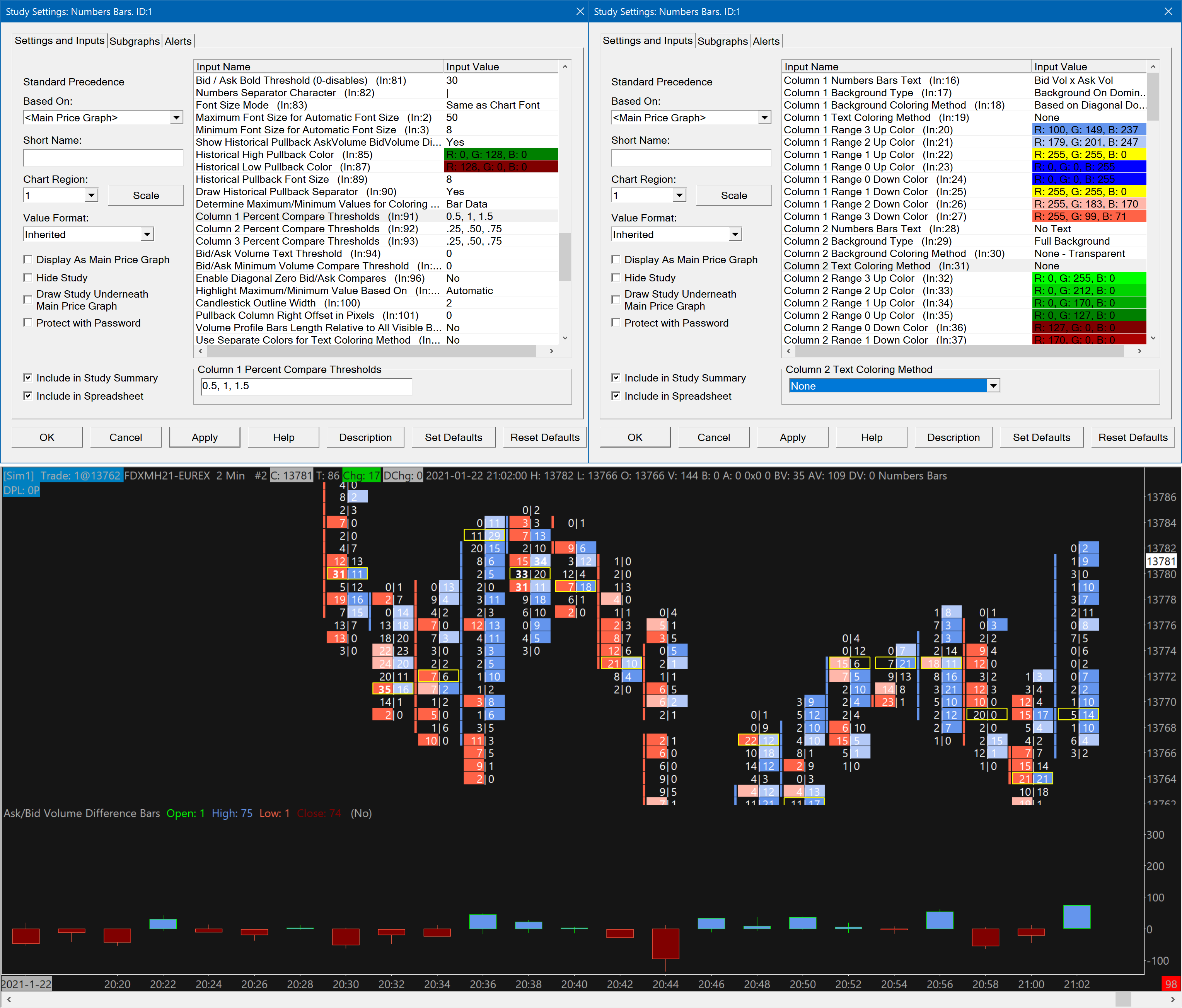 To color both sides you would want to set the following: - Background Type: Background on Dominant Side - Background Coloring Method: Based on Separate AskVol BidVol Percentage For the most reliable, advanced, and zero cost futures order routing, use the Teton service: Sierra Chart Teton Futures Order Routing |