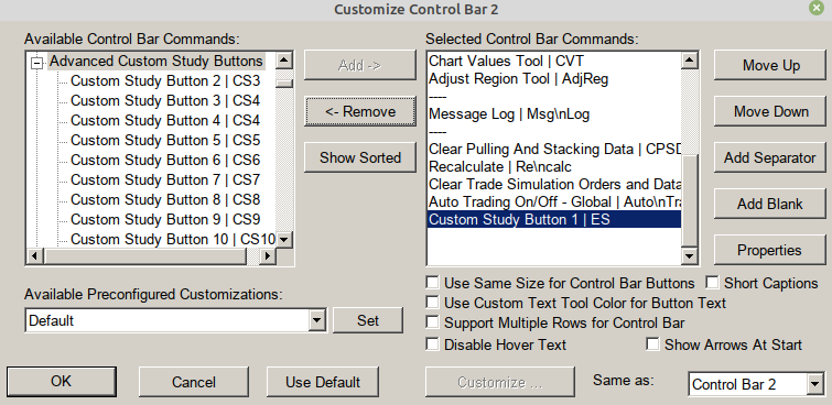 I'm trying to add a button to the menu which enables or disables (yes/no) a selection in a study. Does anyone know how to do this with ACSIL? I've been able to get the following code to enable or disable a study, however, when I try to add a second button, the two buttons get linked/combined so they toggle back and forth rather than independently working. I used different variables for the second button but they were still combined when toggled. This comes from the study: AutomatedTradeManagementBySubgraph.cpp Does anyone know how to add a button for anything other than enabling/disabling a study? The button on the far right (ES) of the first image works to enable or disable the ES study. I also want to have another button to enable/disable longs. The second image is where you add the button to the control menu. This is all done through the customize control bar options. if (sc.IsFullRecalculation)//Is full recalculation { // set ACS Tool Control Bar tool tip sc.SetCustomStudyControlBarButtonHoverText(Input_ACSButtonNumber.GetInt(), "Trade Enable/Disable"); // set Custom Study Control Bar button text if the input to allow custom properties is not true. Otherwise, rely upon what the user sets. if (!Input_AllowCustomPropertiesForControlBarButton.GetYesNo()) sc.SetCustomStudyControlBarButtonText(Input_ACSButtonNumber.GetInt(), "TCCI"); sc.SetCustomStudyControlBarButtonEnable(Input_ACSButtonNumber.GetInt(), Enabled.GetBoolean() ); } // Wait for an event to enable study if not already enabled if (sc.MenuEventID == Input_ACSButtonNumber.GetInt()) { const int ButtonState = (sc.PointerEventType == SC_ACS_BUTTON_ON) ? 1 : 0; Enabled.SetYesNo(ButtonState); } Date Time Of Last Edit: 2021-01-25 03:46:29