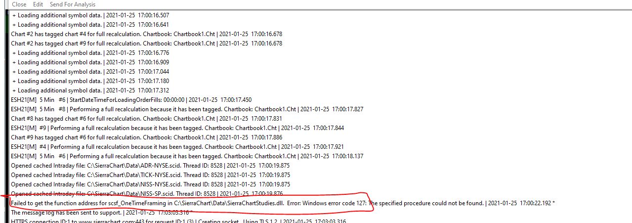 Regarding that particular error, it is harmless but update Sierra Chart to the latest prerelease: Software Download: Fast Update Also most likely it was your security running on your computer causing a problem with Sierra Chart installing the Sierra Chart Studies DLL file. This sounds like a problem that you are having as well based on your description. Sierra Chart Support - Engineering Level Your definitive source for support. Other responses are from users. Try to keep your questions brief and to the point. Be aware of support policy: https://www.sierrachart.com/index.php?l=PostingInformation.php#GeneralInformation For the most reliable, advanced, and zero cost futures order routing, *change* to the Teton service: Sierra Chart Teton Futures Order Routing Date Time Of Last Edit: 2021-01-26 10:09:34