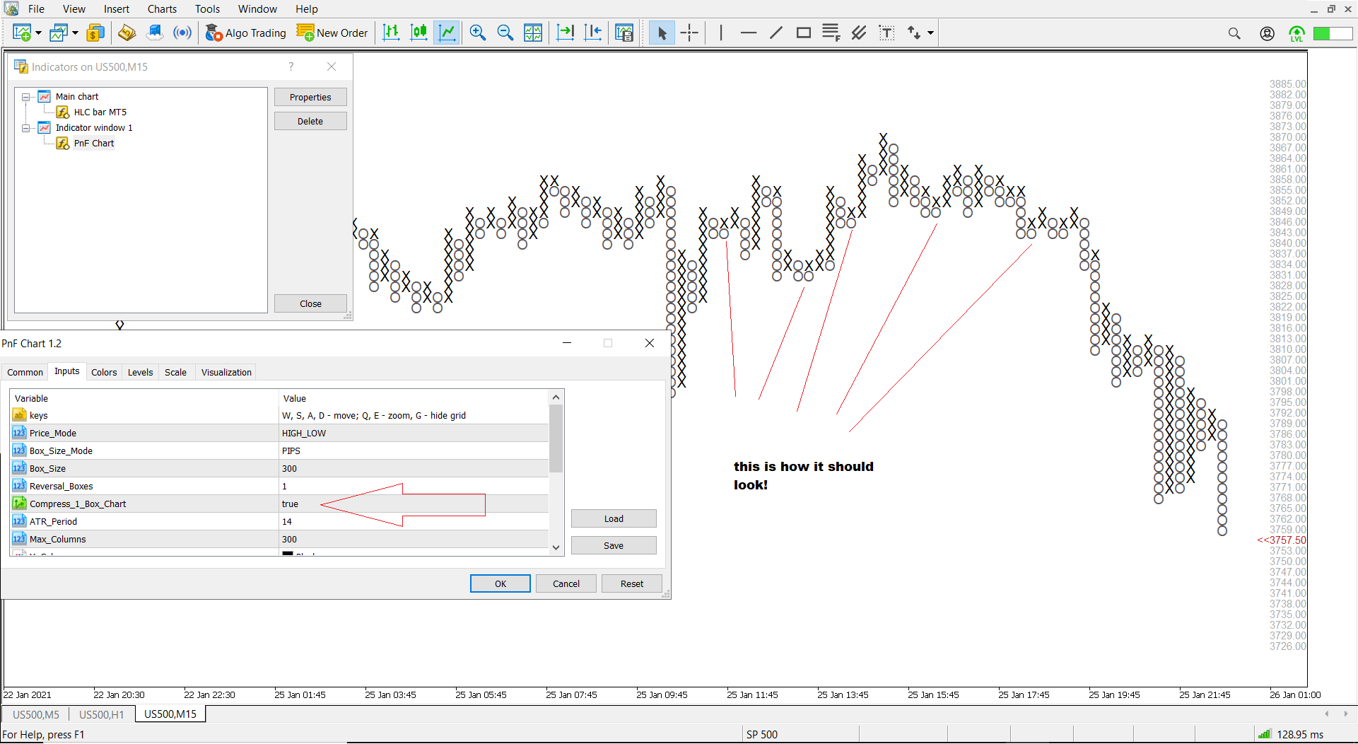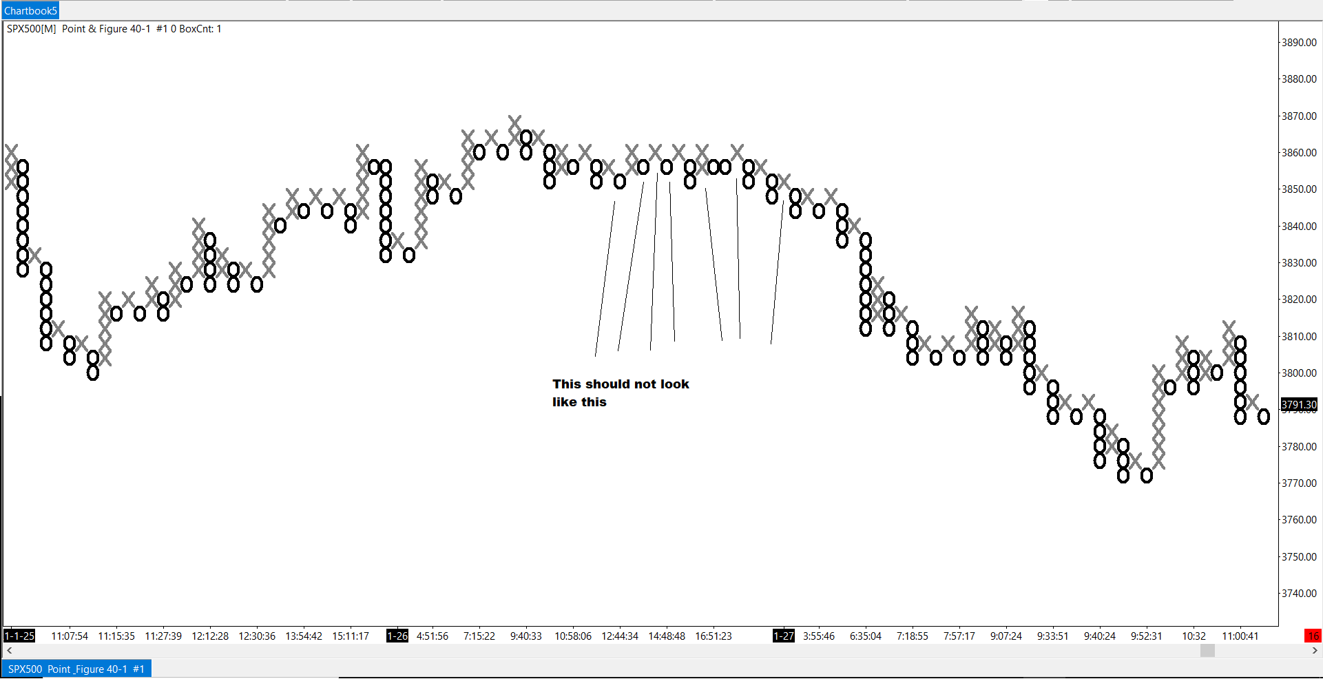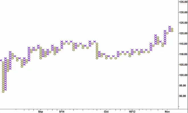 @Sierra Engineering I noticed that the PnF chart does not have the option to compress the 1 box reversal into the same column. This gives a cleaner look to the chart, it should even be something automatic when choosing 1 box reversal. I have attached 2 images, one showing the PnF in Sierra, and other showing a PnF with the correct look for 1 box reversal. |