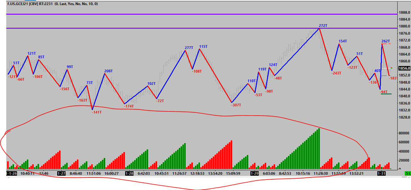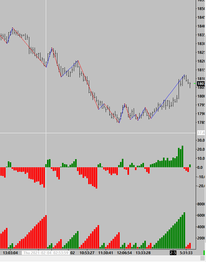 So the zigzag on the price bar correspond with the cumulative volume on the bottom. This is correct, the zigzag looks for turning points and accumulates the volume to the final point in the wave. The study in the middle is set to draw on +/- so it's drawing in comparison to the cumulative volume 1 bar early, given it's picking the point the wave ends/starts i'd say it's correct for drawing based on +/- I don't personally use the ZigZag in that manner so perhaps it's a question for SC Support regarding the drawing based on +/- in this instance. Date Time Of Last Edit: 2021-02-05 10:16:38