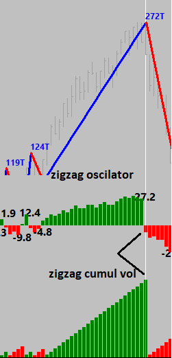 would like to ask another question, the zigzag oscilator worked, however I noticed that the oscilator usually ends 1 bar earlier than zigzag cumulative volume or zigzag indicator.. im sending a picture attached to make it clear. In the pic the wave lenght is 272 ticks, displayed in the zigzag and zigzag oscilator aswell, but if you look at the zigzag oscilator the wave is ending 1 bar earlier, the last bar on zigzag oscilator is a down wave but in the zigzag the wave still up... how can I set the zigzag oscilator to end at the same time of the zigzag? |