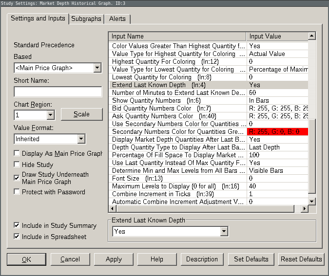 The solution is to make sure you have the Market Depth data for those times and that the number of levels you display covers the full amount of what you want to see. If you have the actual market depth data, then there is no need to use the "Extend Last Known Depth". If you are using our Denali Exchange Data Feed, then refer to the following for how to get historical market depth data: Market Depth Historical Graph: Downloading Of Historical Market Depth Data For the most reliable, advanced, and zero cost futures order routing, use the Teton service: Sierra Chart Teton Futures Order Routing |
