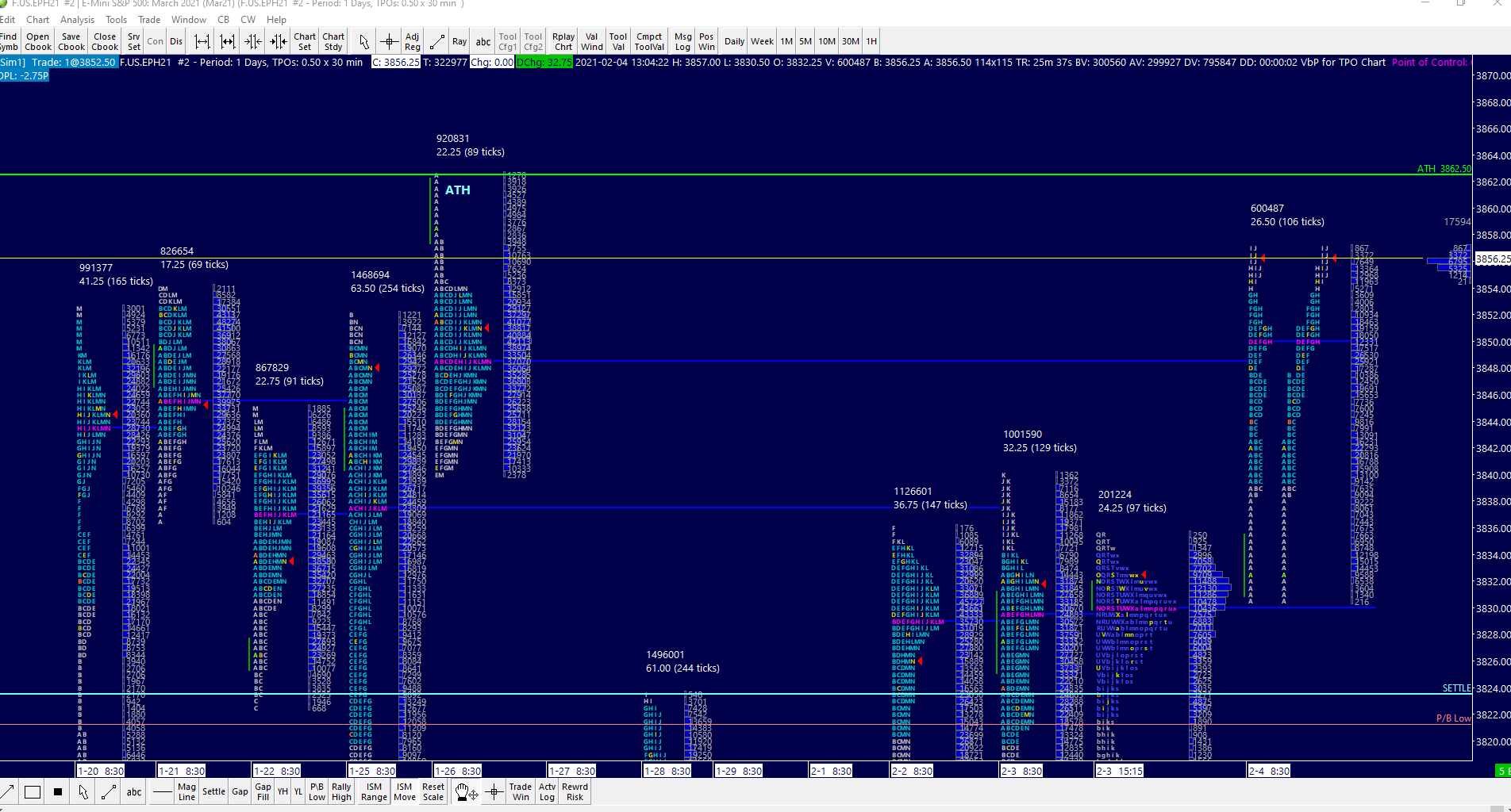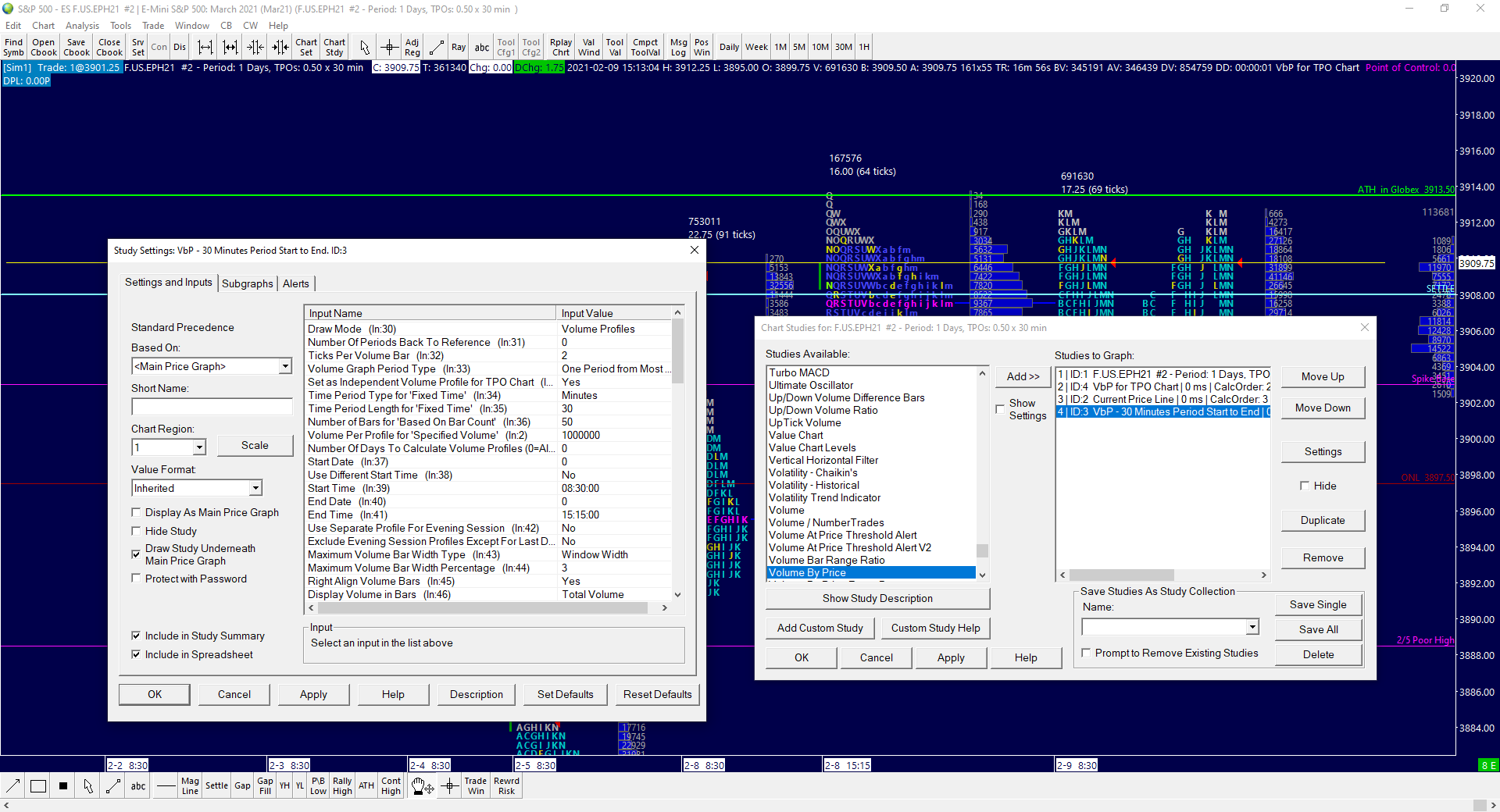 I'm trying to only see the volume histogram for the current and previous day only (not every day in the TPO chart). Also the volume numbers get crowded and obscure the histogram. I would like to get rid of them and view the histogram only. I've attached the settings of how I did last 30 min period histogram and how I split profiles using "Letter/Blocks in Own Column and Standard Profile".