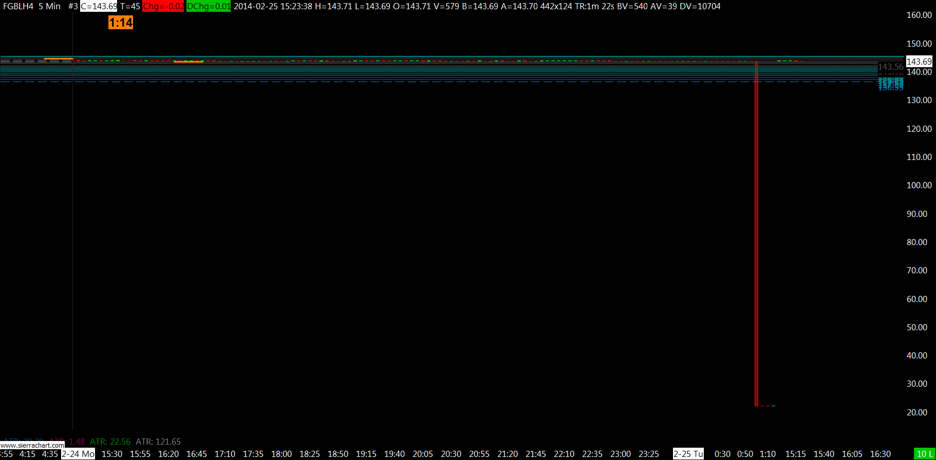 Hi, I had a few wrong price data entries from OEC yesterday. Afterwards I didn't get any new data for the rest of the day. Today I am getting new data , but the errors as well as the gap from yesterday remain. The data error also shows on my SC Log but I'm not sure what exactly the log entry means. I have tried to - Delete/Download Data for yesterday, with the same result. - Delete the specific data records, with the same result. On my OEC Trader the data records are correct. Please help. Here is the chart, and the log: http://www.sierrachart.com/image.php?l=1393313028573.png Open E Cry FIX/FAST - Connecting to trading server prod.openecry.com:9400. | 2014-02-25 14:50:28 Resolved address prod.openecry.com to IP 64.94.37.206 | 2014-02-25 14:50:28 The network socket is connected. | 2014-02-25 14:50:29 The socket starting SSL connection. | 2014-02-25 14:50:29 SSL socket is now connected. | 2014-02-25 14:50:30 OEC FIX Trading session: Sending the Logon message. | 2014-02-25 14:50:30 Open E Cry FIX/FAST: Connected to trading server. | 2014-02-25 14:50:35 Open E Cry FIX/FAST: Connecting to FAST market data server: prod.openecry.com:9301. | 2014-02-25 14:50:35 Resolved address prod.openecry.com to IP 64.94.37.206 | 2014-02-25 14:50:35 The network socket is connected. | 2014-02-25 14:50:35 OEC FAST Market Data session: Sending the Hello message. | 2014-02-25 14:50:35 OEC FAST Market Data session: Sending the Logon message. | 2014-02-25 14:50:36 Open E Cry FIX/FAST: Connected to the market data server. | 2014-02-25 14:50:36 Open E Cry FIX/FAST: Connected. | 2014-02-25 14:50:36 Open E Cry FIX/FAST - Starting real-time market data updates for: FGBLH4 | 2014-02-25 14:50:48 HD Request # 2 - Downloading Intraday chart data for FGBLH4 to the file FGBLH4.scid. Service: oec | 2014-02-25 14:50:48 HD Request # 2 - Download start Date-Time: 2014-02-25 01:16:16.0 | 2014-02-25 14:50:48 HD Request # 2 - Using server: ds4.sierracharts.com port 10149 | 2014-02-25 14:50:48 Resolved address ds4.sierracharts.com to IP 204.11.49.26 | 2014-02-25 14:50:48 Requesting market depth updates for: FGBLH4 if supported. | 2014-02-25 14:50:48 The network socket is connected. | 2014-02-25 14:50:49 HD Request # 2 - Sending historical data logon request message. | 2014-02-25 14:50:49 HD Request # 2 - Requesting up to 1095 days of Intraday data. Record interval: 1 | 2014-02-25 14:50:50 HD Request # 2 - Decompressing data. | 2014-02-25 14:50:50 HD Request # 2 - Receiving Intraday data for FGBLH4 starting at 2014-02-25 01:16:27 | 2014-02-25 14:50:52 HD Request # 2 - Historical error filtered for FGBLH4, Prior High = 22.105000, Prior Low = 22.105000, High = 143.669998, Low = 143.660004, Time Difference = 11 seconds, Percentage = 200.219989%. | 2014-02-25 14:50:52 HD Request # 2 - Historical error filtered for FGBLH4, Prior High = 22.105000, Prior Low = 22.105000, High = 143.660004, Low = 143.660004, Time Difference = 12 seconds, Percentage = 200.239992%. | 2014-02-25 14:50:52 HD Request # 2 - Historical error filtered for FGBLH4, Prior High = 22.105000, Prior Low = 22.105000, High = 143.660004, Low = 143.660004, Time Difference = 28 seconds, Percentage = 200.559998%. | 2014-02-25 14:50:52 HD Request # 2 - Historical error filtered for FGBLH4, Prior High = 22.105000, Prior Low = 22.105000, High = 143.669998, Low = 143.669998, Time Difference = 51 seconds, Percentage = 201.020002%. | 2014-02-25 14:50:52 HD Request # 2 - Historical error filtered for FGBLH4, Prior High = 22.105000, Prior Low = 22.105000, High = 143.660004, Low = 143.660004, Time Difference = 80 seconds, Percentage = 201.600003%. | 2014-02-25 14:50:52 HD Request # 2 - Historical error filtered for FGBLH4, Prior High = 22.105000, Prior Low = 22.105000, High = 143.660004, Low = 143.660004, Time Difference = 95 seconds, Percentage = 201.900005%. | 2014-02-25 14:50:52 HD Request # 2 - Historical error filtered for FGBLH4, Prior High = 22.105000, Prior Low = 22.105000, High = 143.660004, Low = 143.660004, Time Difference = 159 seconds, Percentage = 203.180003%. | 2014-02-25 14:50:52 HD Request # 2 - Historical error filtered for FGBLH4, Prior High = 22.105000, Prior Low = 22.105000, High = 143.660004, Low = 143.660004, Time Difference = 172 seconds, Percentage = 203.439999%. | 2014-02-25 14:50:52 HD Request # 2 - Historical error filtered for FGBLH4, Prior High = 22.105000, Prior Low = 22.105000, High = 143.660004, Low = 143.660004, Time Difference = 173 seconds, Percentage = 203.460002%. | 2014-02-25 14:50:52 HD Request # 2 - Historical error filtered for FGBLH4, Prior High = 22.105000, Prior Low = 22.105000, High = 143.669998, Low = 143.669998, Time Difference = 174 seconds, Percentage = 203.480005%. | 2014-02-25 14:50:52 HD Request # 2 - Historical error filtered for FGBLH4, Prior High = 22.105000, Prior Low = 22.105000, High = 143.660004, Low = 143.660004, Time Difference = 180 seconds, Percentage = 203.600001%. | 2014-02-25 14:50:52 HD Request # 2 - Historical error filtered for FGBLH4, Prior High = 22.105000, Prior Low = 22.105000, High = 143.660004, Low = 143.660004, Time Difference = 182 seconds, Percentage = 203.640008%. | 2014-02-25 14:50:52 HD Request # 2 - Historical error filtered for FGBLH4, Prior High = 22.105000, Prior Low = 22.105000, High = 143.660004, Low = 143.660004, Time Difference = 183 seconds, Percentage = 203.660011%. | 2014-02-25 14:50:52 HD Request # 2 - Historical error filtered for FGBLH4, Prior High = 22.105000, Prior Low = 22.105000, High = 143.660004, Low = 143.660004, Time Difference = 240 seconds, Percentage = 204.800010%. | 2014-02-25 14:50:52 HD Request # 2 - Historical error filtered for FGBLH4, Prior High = 22.105000, Prior Low = 22.105000, High = 143.669998, Low = 143.669998, Time Difference = 259 seconds, Percentage = 205.180001%. | 2014-02-25 14:50:52 HD Request # 2 - Historical error filtered for FGBLH4, Prior High = 22.105000, Prior Low = 22.105000, High = 143.669998, Low = 143.669998, Time Difference = 264 seconds, Percentage = 205