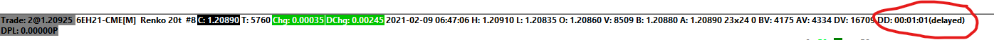 That indicates the delay of just one minute. This may be due to your computer's clock not being set correctly. Refer to: Incorrect Date and/or Time Display, Missing Historical Intraday Data, Chart Not Updating Sierra Chart Support - Engineering Level Your definitive source for support. Other responses are from users. Try to keep your questions brief and to the point. Be aware of support policy: https://www.sierrachart.com/index.php?l=PostingInformation.php#GeneralInformation For the most reliable, advanced, and zero cost futures order routing, *change* to the Teton service: Sierra Chart Teton Futures Order Routing |