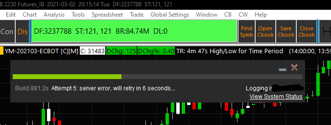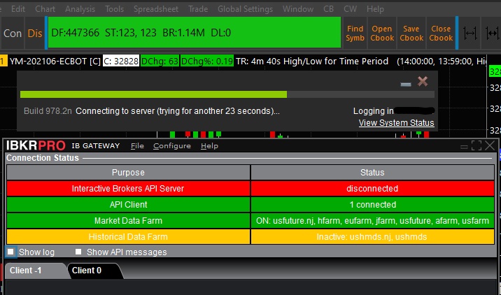 Interesting. Yeah, I use 2 instances of SC: 1 for IB, another for Futures. For the IB I use SC's live equities datafeed (NYSE/NQ/AMEX feed). I don't care about Level II in IB for stocks (I do pay for Level II options etc.). If the statement that "IB uses a single connection for Data Feeds and Order Routing" is true, then when IB market data is down, then no orders are routed. However, I remember a few instances in TWS where I'd get market data down, but still be able to execute (edit: thanks User379468 for seemingly clarifying this! and yes, if differentiating between "SC -> IB connected and SC -> IB's trading connection lost" could be implemented, COOL!). Maybe there was a timing issue with the system status delaying connectivity, and in that situation market data really was active but the system was just slow in telling me it was back online? This is something I'd want to be sure of since if IB's data went down, and I still could enter orders, then that provides some redundancy since I use Barcharts datafeed (SC's data) which I find does not have intermittency issues. It's pretty hard to feel confident entering orders with a datafeed that is intermittent all the time like GFIS. On the theme, thanks! I use Windows 10. I also have a dedicated rig. Here's the YouTube video for dark theming Sierra Chart: https://youtu.be/AhvbhGyvT3I Date Time Of Last Edit: 2021-03-17 03:53:42