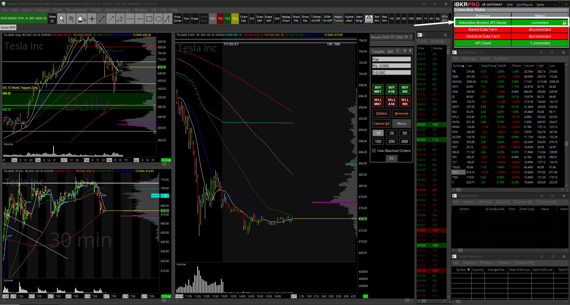 Risk101 - Nice setup and dark theme! At first I thought how on earth did you get that then I realized I think you are using SC on Linux...? I have a dedicated trading rig and I'm getting pretty close to changing OS from Windows to Linux for that simple reason, the light grey borders drive me crazy! Regarding IB, the Denali Feed & SC I think your suggestion and layout is a necessity you simply have to be able to monitor the IB connection since SC isn't and it happens daily (at 12am) and at least a few other times a month. You are correct if the API server is red, orders are not routed and if you are using the Denali Feed SC will still show green. I am actually going to turn off the Denali Feed entirely on my IB SC instance and use IB's data feed connection. My situation is slightly different, I use another instance of SC/Denali with another broker as my primary and place trades based on that setup into the IB one. So in my case I'm not really relying on the Denali feed for that particular IB/SC setup. I'm curious too if SC will show yellow/disconnect during those times, I think so because I believe IB uses a single connection for Data Feeds and Order Routing... Date Time Of Last Edit: 2021-03-17 02:55:41