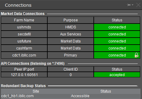 IB seems to separate market data and trading connections per the audible alerts for each one when either is disconnected in TWS, and the TWS Data Connections Status Monitor also shows multiple backups, attached. A separate status monitor in SC for Market Data Feed (SC Denali), and for Trading Connection (IB), the way IB does this with status of each and it's backups would be great. Also auto switchover from Denali to IB feed in case of a drop in Denali would also be great. |