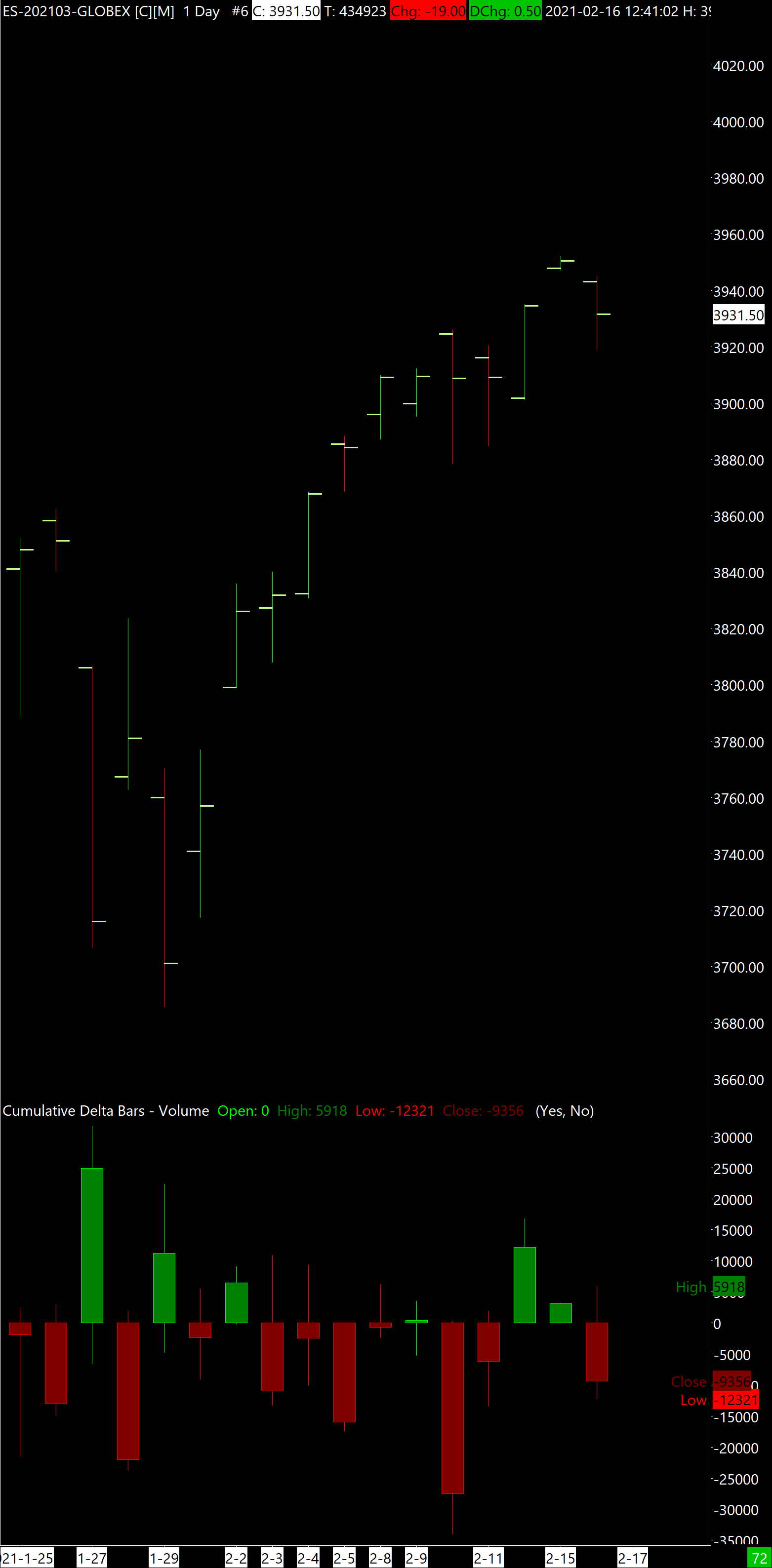 Thank you for the response. I could not get that fix to work. Please see below. I do not see the option to change the study inputs. Here is a screenshot of the chart with the cumulative delta bars study. http://www.sierrachart.com/image.php?Image=1613500863712.png I also added a screenshot of the study settings and where I looked at the input options |