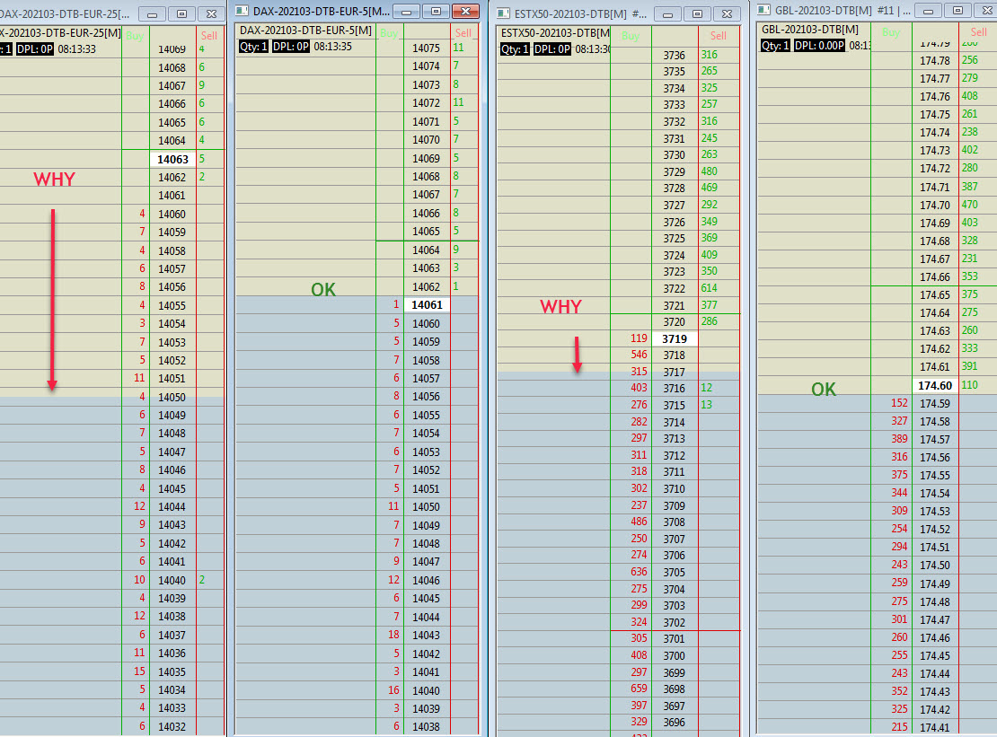 Hi, SC 2230 Some odd aspect of the DOM for DAX-25 and ESTX50 : the bluish area is out of step with the last price. DAX-5 and GBL ok. All was fine yesterday (same SC version). Thanks for your help ! Regards, JM |