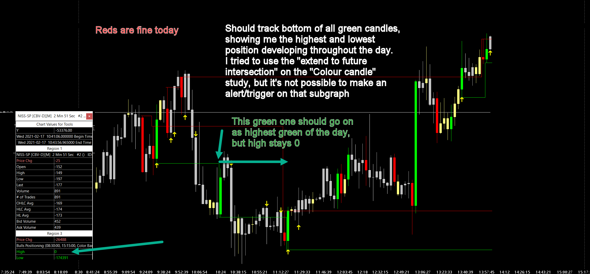 Hi John I have it set to a value from the candle. So if PVOL(Volume) is above average, then it highlights as liquidity on the chart. I want the high/low to track these highlighted candles, but it doesn't work well when using the "show developing high/low". So hard to explain. I just assumed it was because of zeros (the chart is NVOL so it can be above/below zero). See screenshot: http://www.sierrachart.com/image.php?Image=1613591136631.png 3rd pane down with the green/red NVOL candles. They're highlighted based on PVOL > above average and NVOL being either positive or negative. It's to give an idea of bullish/bearish positioning in the market. Then I use high/low to show when a previous position gets liquidated. |