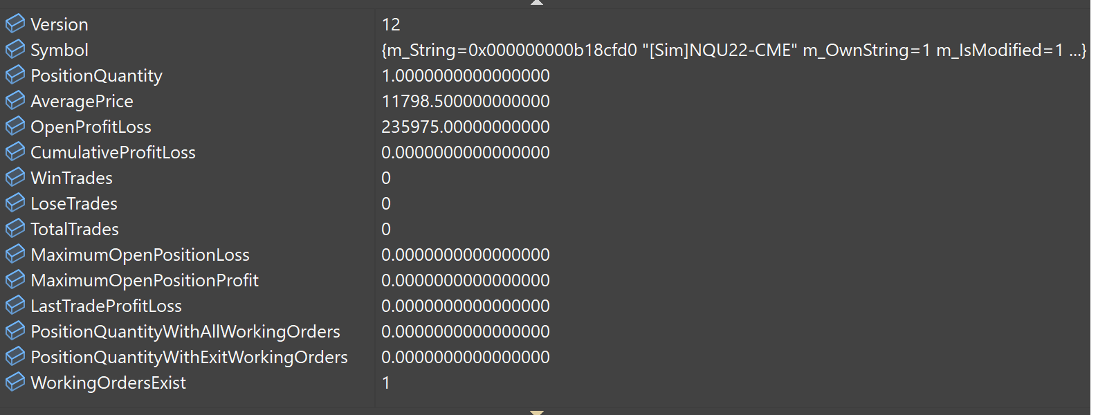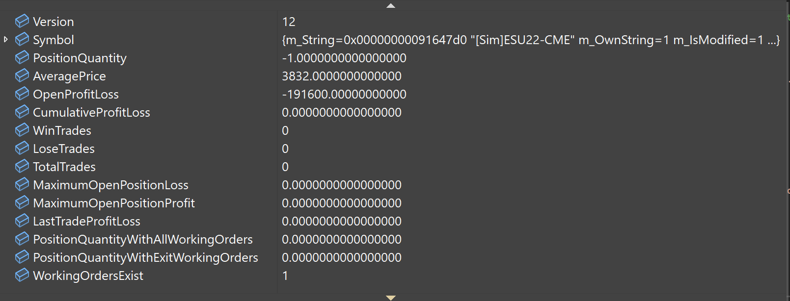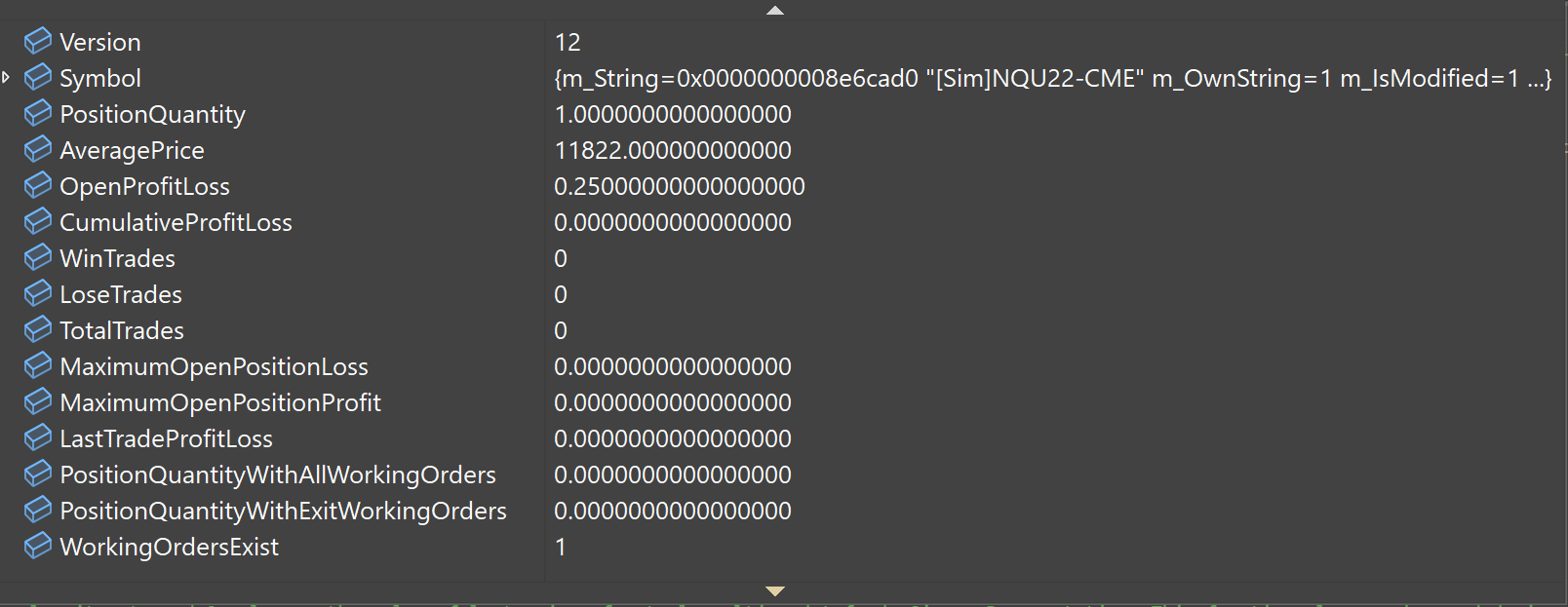 s_SCTradeOrder entryOrderDetails; while (sc.GetOrderForSymbolAndAccountByIndex("", sc.SelectedTradeAccount, iOrder, entryOrderDetails) != SCTRADING_ORDER_ERROR) { iOrder++; if (entryOrderDetails.OrderStatusCode == SCT_OSC_FILLED) { s_SCPositionData positionData; if (sc.GetTradePositionForSymbolAndAccount(positionData, entryOrderDetails.Symbol, sc.SelectedTradeAccount)){ .... I use simulaton mode for development and testing, but I can try out live mode as well if needed. As Sierra Engeineer had suggested I tried build a workaround with sc.GetSymbolDataValue() function. I managed to get last price information and then I made calculation of Open PnL by myself. For me this workaround solves the problem in the moment. Date Time Of Last Edit: 2022-07-13 07:35:31