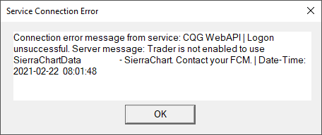 For any CQG connectivity issues you need to contact your broker. We do not help with those. You can see the relevant error in the Service Connection Error box that pops up. Sierra Chart Support - Engineering Level Your definitive source for support. Other responses are from users. Try to keep your questions brief and to the point. Be aware of support policy: https://www.sierrachart.com/index.php?l=PostingInformation.php#GeneralInformation For the most reliable, advanced, and zero cost futures order routing, *change* to the Teton service: Sierra Chart Teton Futures Order Routing |