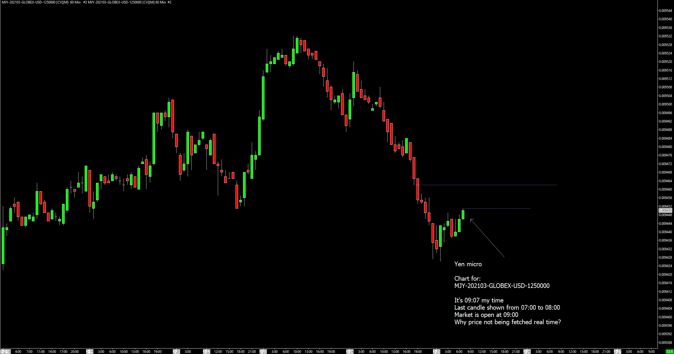 See this chart: http://www.sierrachart.com/image.php?Image=1614208216556.png It's 09:07 my time Last candle shown from 07:00 to 08:00 Market is open at 09:00 Why price not being fetched real time? Yen micro Chart for: MJY-202103-GLOBEX-USD-1250000 |