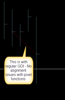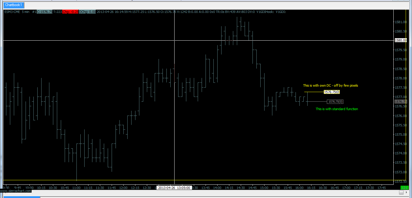 SC Team - Don't know if you are following thread or not - now that you have marked this thread as User Discussion. In case if you do - Just wanted to update you that even GDI+ works as well with this structure. One interesting observation is - When a line is drawn from point 1 to poin 2 - If they are painted through p_GDIFunction - Everything works fine. When the same points are used through own WindowDC - they are off by some means. Wondering if you do any co-ordinate transformation within the function - p_GDIFunction? Basically if these co-ordinates can be aligned with own WindowDC function - Technically "SC" structure can be exposed as well with custom function - with the call - DrawPaint(sc,hwnd); - hwnd is just the window handle and within the function - HDC can be declared directly if you can shed some light on this it would be much appreciated. Not expecting you would answer this - but "hoping" you would answer as exposing SC structure would be a "complete" solution to support this GDI :) Thanks http://www.sierrachart.com/image.php?l=1367176716538.png main() { sc.p_GDIFunction = DrawGraph; //Co-ordinates are fine but SC structure is not available to the function HWND hwnd = sc.ChartWindowHandle; DrawGraphOwnDC(sc, hwnd); // If the same co-ordinates are used with this method - they are off on screen but advantage is 'SC' structure is available } void DrawGraph(HWND hwnd, HDC hdc) { // draw commands -- These graphs align well } void DrawGraphOwnDC(SCStudyInterfaceRef sc, HWND hwnd) { HDC hdc = GetWindowDC(hwnd); // draw commands -- These graphs are off by few pixels } Date Time Of Last Edit: 2013-04-28 19:18:59