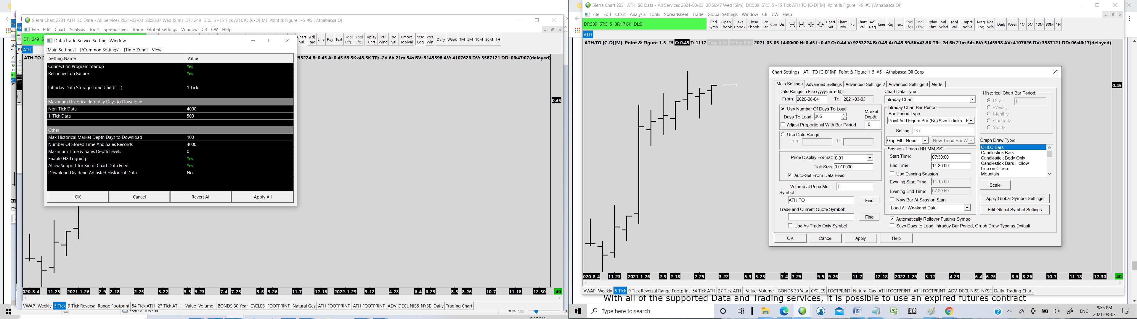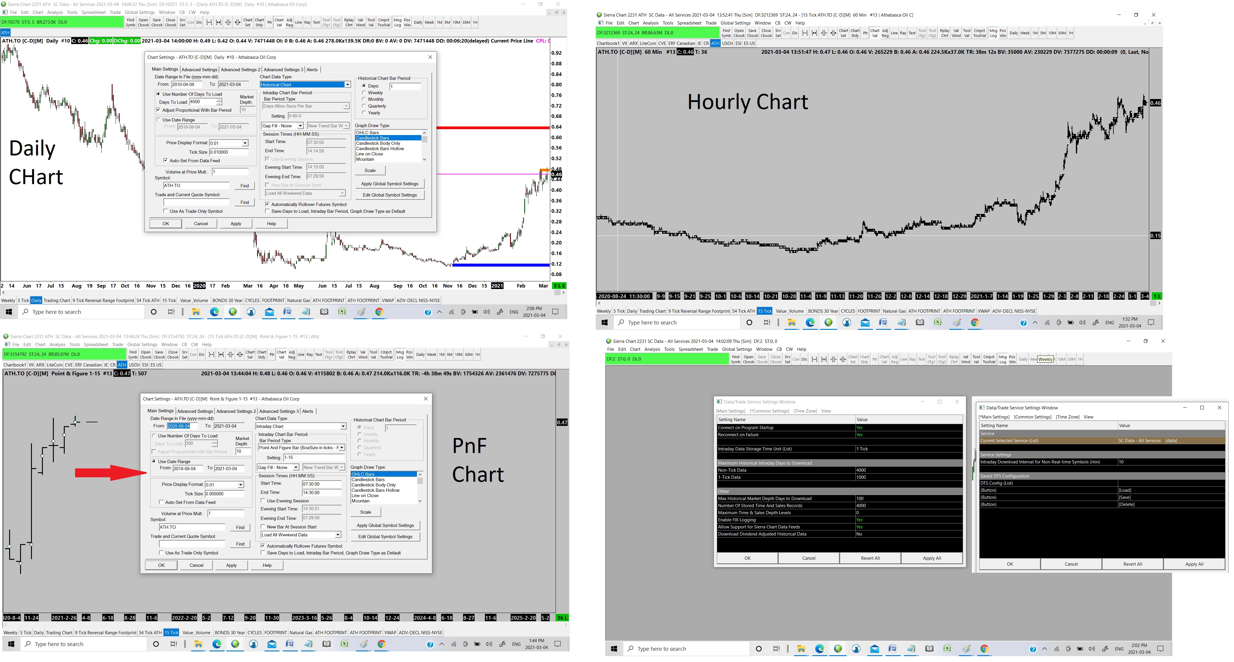 Hi, I'll try to explain my setup. The main focus is PnF charts. I subscribe to Sierra Charts real time TSX data. I need to use Weekly, Daily and PnF charts. When I use time based charts like the weekly, Daily there is 5-10 years of data. (Good) If I use hourly or PnF charts there is only ~ 4 months. (for short term PnF's (1-10 box size) that is OK but I also need to use longer term PnF's (1-60 box size) I attached a screen shot that has a Daily chart that displays about 7 years of data using Historical Charts. When using Hourly/minute and PnF charts there is no other choice but to use Intraday Charts. Only about ~ 4 months of data are displayed. If I use Historical Charts for PnF charts, Sierra Charts will only display Daily bars not PnF bars. So, that is the dilemma, I have to use Intraday Charts for the PnF's but there is no real data. I have Data set to SC Data - All Services. If there is no longer term Intraday Charts data, how can I use Historical Charts data using PnF charts? Need help ! Regards, Daniel |
