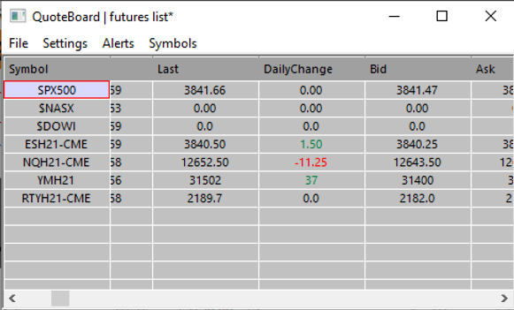 Here is my Quote Board and I get no data for $NASX and $DOWI. Even though SPX500 shows last price it doewsn't show change for the day and neither does RTYH21-CME.