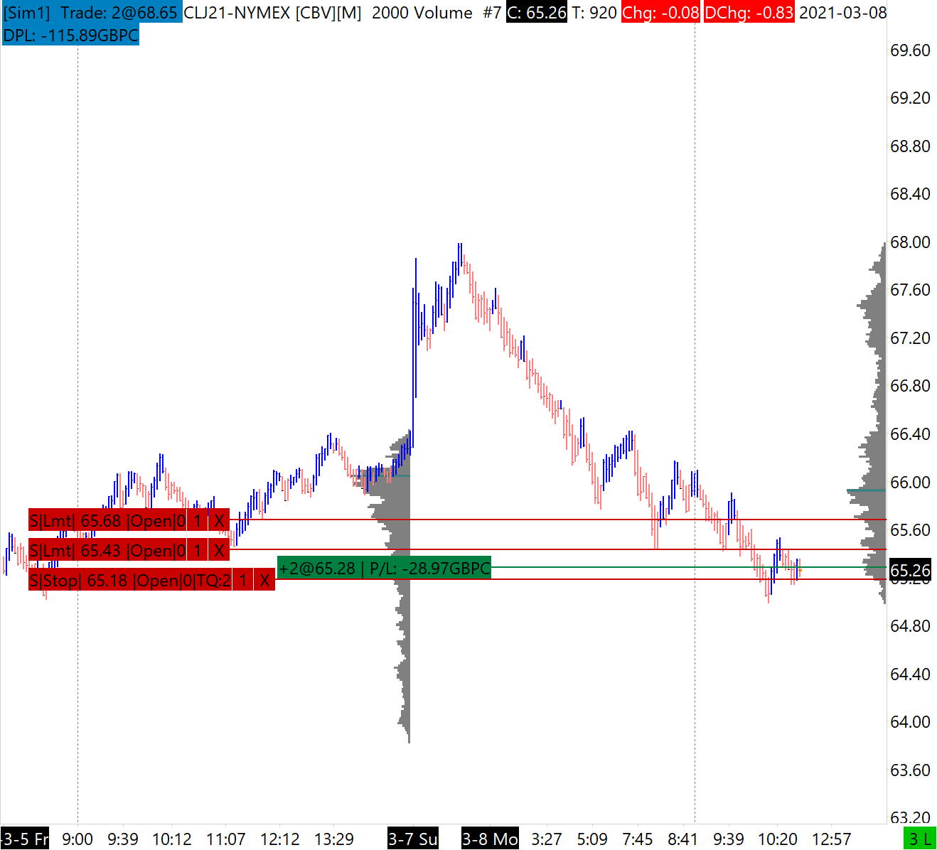 Hi, I am just getting started with sierra chart. I have two charts open in the same chartbook and I am simulation trading (ESH21-CME and CLJ21-NYMEX). When I placed my buy or sell market orders, I would get working order lines for each trade on both charts. Now, if I place "buy market" or "sell market" order on ES, I do not get the working order trade lines to adjust my stop and profit targets. If I order on CLJ21-NYMEX, I still get the stop and profit targets. Did I mess up one of the settings by accident? I can not find what is wrong for the life of me! Thanks, Siva http://www.sierrachart.com/image.php?Image=16152187468.png - unable to see stop and limits http://www.sierrachart.com/image.php?Image=1615218888772.png - able to see stop and limits. |
