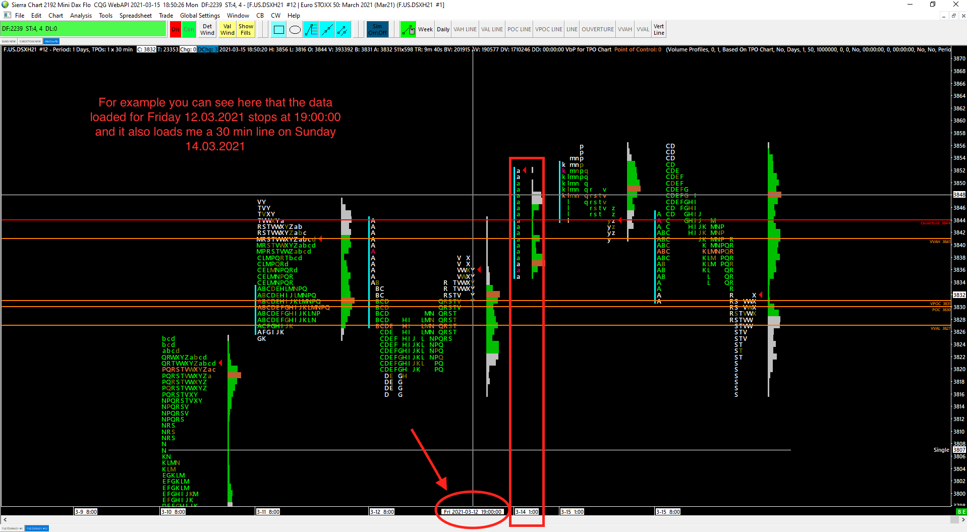 Hello, Sorry for the late reply. I can confirm that these are the EUREX symbols : F.US.DB (FGBL) / F.US.DSX (EUROSTOXX 50) / F.US.FDXM (MINI DAX) For example : - 05.03.2021 : the historical data stop at 15:30:00 - 08.03.2021 : the data started to load at 08:30:00 - 12.03.2021 : the historical data stop at 19:00:00 - 14.03.2021 : It is sunday and the Market Profile loaded one period of 30 min at 01:00:00 am ?? I made some screenshots. Date Time Of Last Edit: 2021-03-15 18:17:13