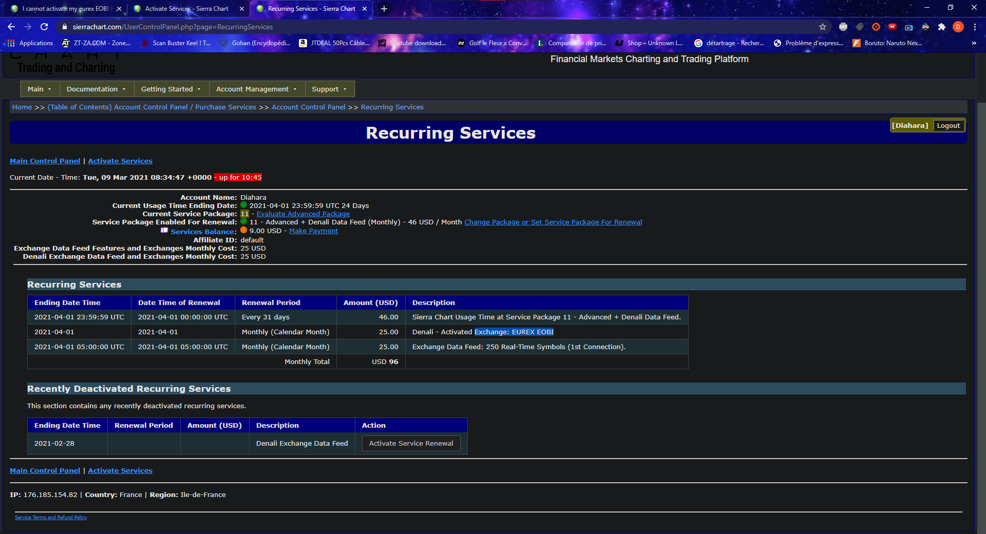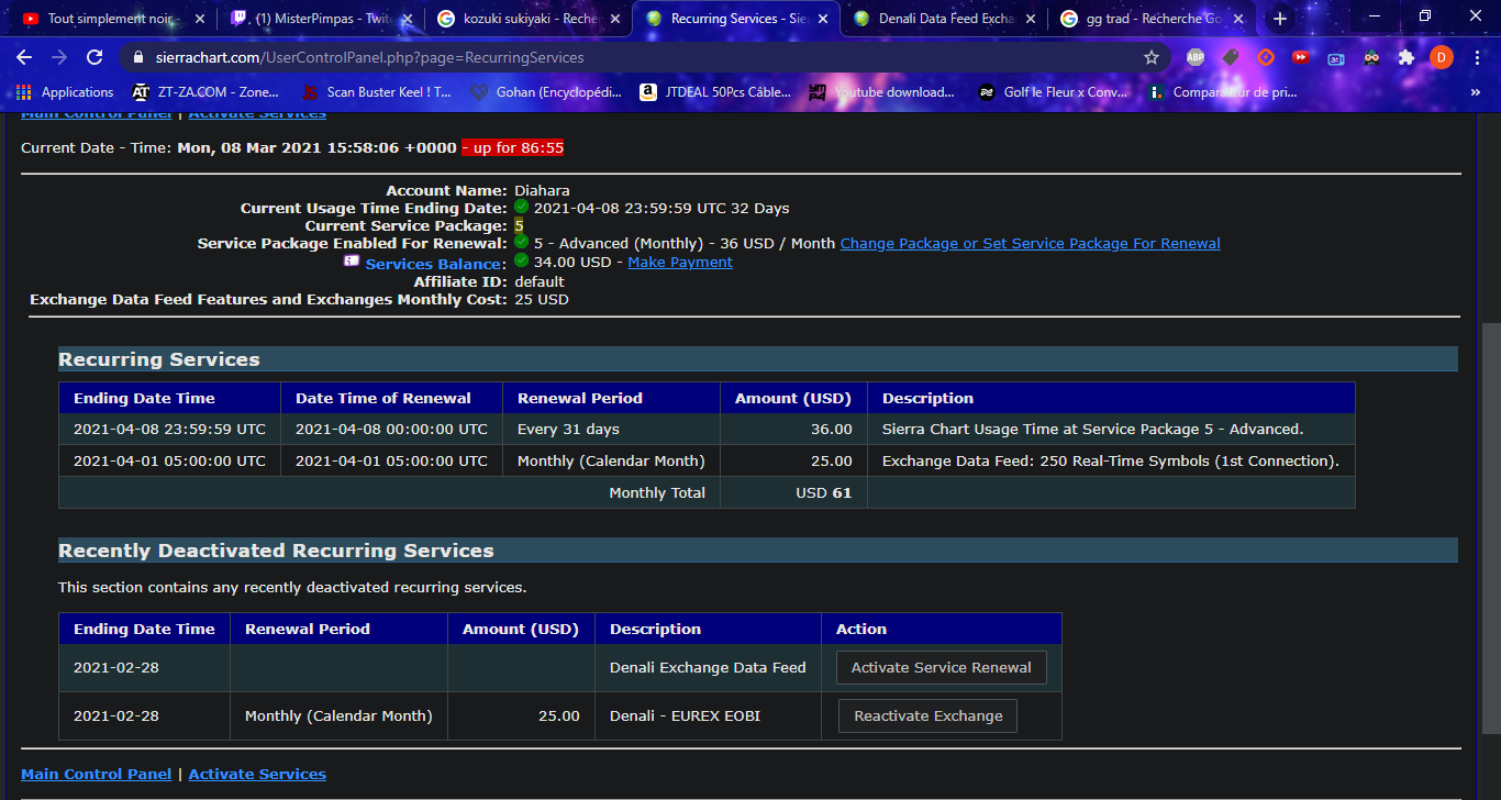 Hi there, the Denali Data Feed is not currently active on your Sierra Chart Account (it expired on Feb 28th), the Denali Data Feed can only be accessed through one of the New Packages, so you would need to activate SP10, SP11 or SP12 -- the good news is Denali is greatly reduced in price. (A) For Information on those New combined Packages: Description of Service Packages and Pricing: Packages (B) To add usage time on one of the New Packages to your Sierra Chart account, follow these instructions: 1. Select "Help >> Add Usage Credit" on the Sierra Chart software menu. You can also go to this page in your browser: https://www.sierrachart.com/UserControlPanel.php?page=ServicesActivation Login with your Sierra Chart Account Name and Password. 2. Choose the particular Service Package that you want to automatically renew. 3. Add sufficient credit to your Services Balance using any of the available payment options: https://www.sierrachart.com/UserControlPanel.php?page=AddAccountCredit For further information, refer to: Sierra Chart Purchase and License Information: Renewing Access (C) Lastly if you have Denali Data Activated you will complete the process by activating a Real-time Exchange, either within the CME Group, or EUREX EOBI, see #3 here: https://www.sierrachart.com/UserControlPanel.php?page=ServicesActivation#DenaliCME or https://www.sierrachart.com/UserControlPanel.php?page=ServicesActivation&UserID=228734#DenaliEUREX Date Time Of Last Edit: 2021-03-08 20:18:00