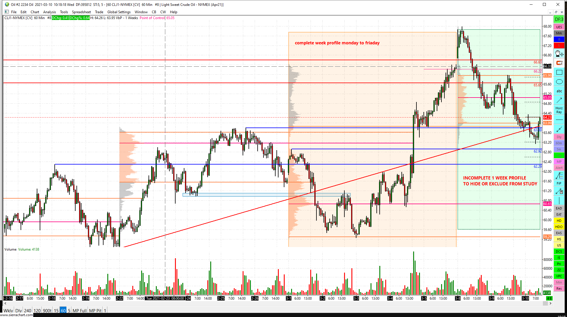Hi,  I'm using the volume by price study on my hourly charts which I set to display multiple profiles on a weekly base. The study shows all weekly profiles very well however it also shows the current week profile, which as the week has not ended is incomplete and messes my chart. Is there a way to exclude or hide the last profile in view IF the full period (in this instance 1 week) has not been completed ? Attached a chart example in which you can see a week volume profile is drawn from last Monday until now Wednesday, when I would like to have only complete Monday to Friday profiles (based on 1 week - 5 days not 3 days) Can this be achieved ? http://www.sierrachart.com/image.php?Image=1615367900267.png Thanks  |