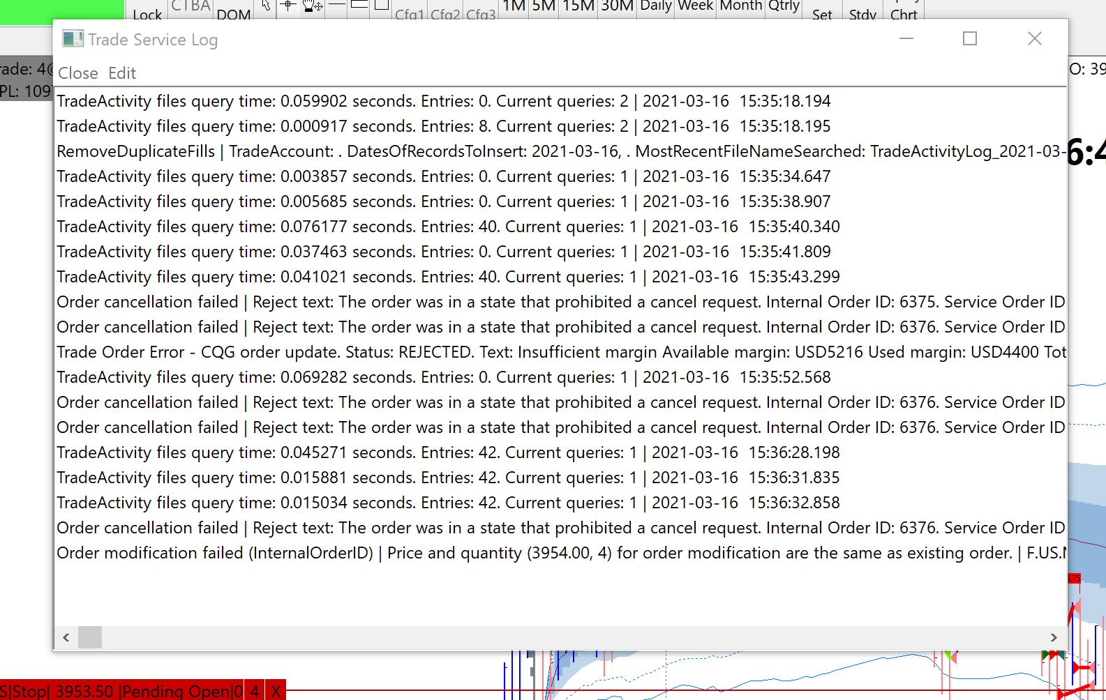 First thing, if you need to get out of a position and you are not able to do so from the software, then be sure you call your broker and get the issue resolved. From what the previous image showed, at one point you did not have enough margin to cancel. Refer to the following setting that may help with this issue: Global Trade Settings Windows: Hold Market Order Until Pending Cancel Orders Are Confirmed (Global Settings >> General Trade Settings >> General) You would really need to ask your broker what the other error messages are in relation to. Those are CQG errors. For the most reliable, advanced, and zero cost futures order routing, use the Teton service: Sierra Chart Teton Futures Order Routing |