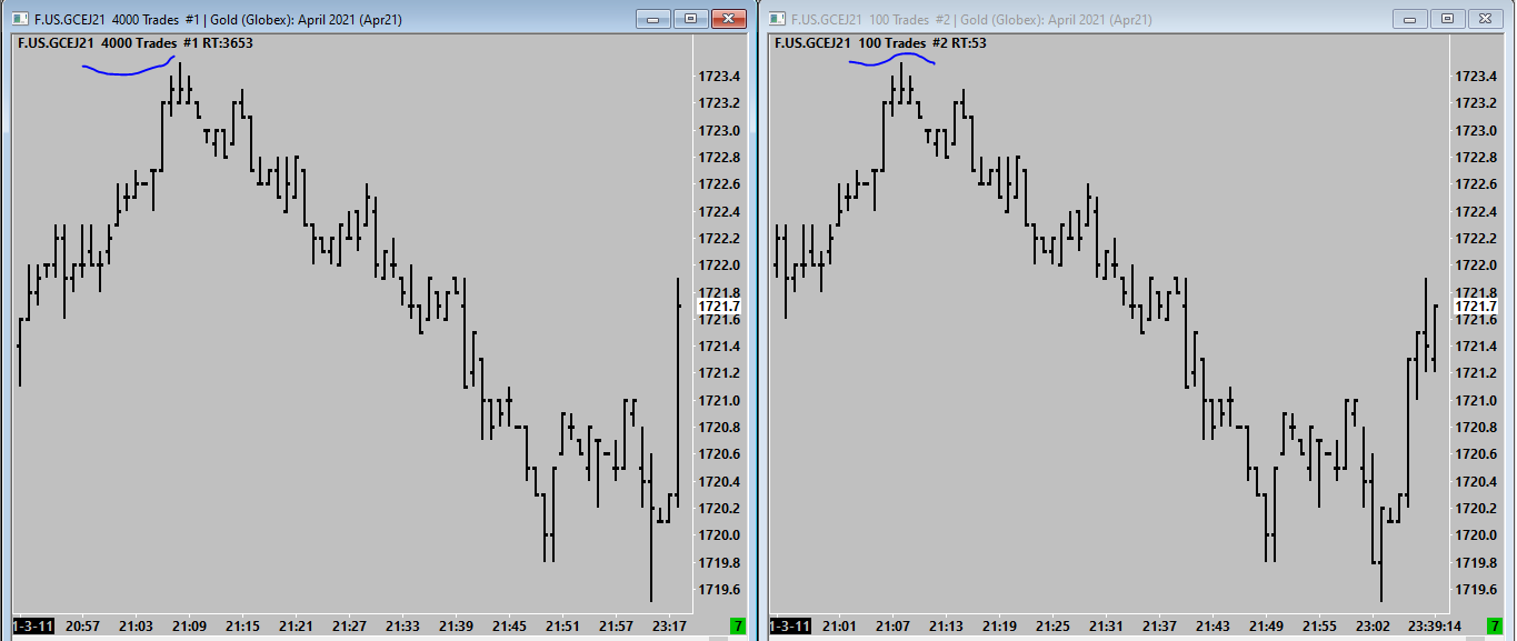 Hello Im trying to use the "Number of trades per bar" chart but its not working properly I attached a picture to make it clear... 4000 trades (left) and 100 trades (right) - both charts looks the same, but ofc they should look different as the number of trades are not the same I noticied that the tick chart seems looks about the same as the previous chart that it was made off... so if you make it off 1 min chart it ill look like the 1 min chart, if make it off 1 hour it ill look like the hourly and so on... Current version: 2238 |