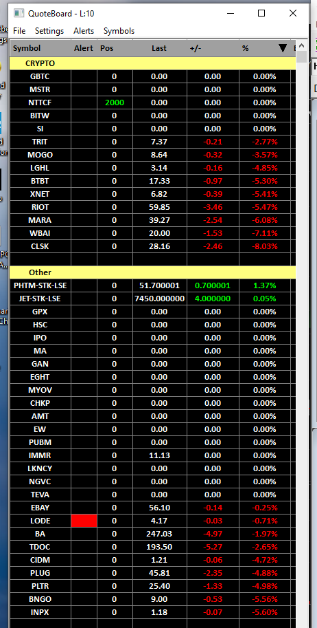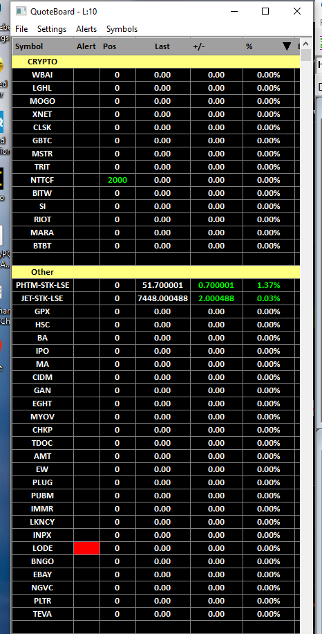 Non of the symbols are updating (apart from UK which are probably coming from IB since I cannot get any UK prices from SC). Attached is a screen shot with SC real time turned on and one with IB only. You can see that there are no prices with SC but there are when I turn off SC and just have IB. To get it to work after starting up I have to switch off SC support, disconnect data feed, reconnect with IB only then I can turn SC back on. This seems to be working just now. Thanks BTW - I am a huge fan of SC and have been for over 10 years. Tried other charting packages but just cannot beat SC on charting, TPO and VP. |