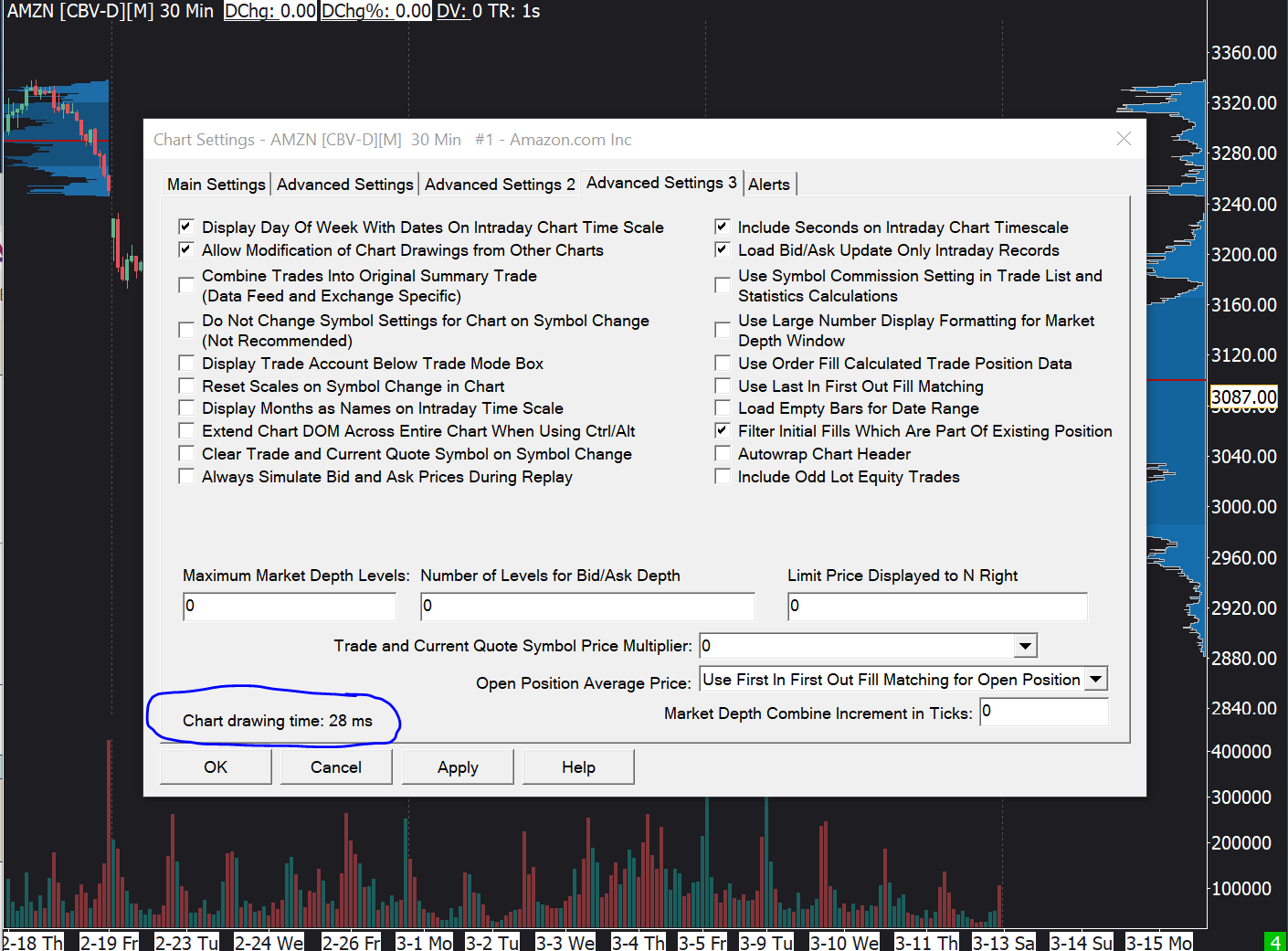 I'd like to follow up with some stats to show how bad this problem is for a stock like AMZN. I literally can't use SC because the lag becomes so bad due to the excessive computation in the VbP study for so many tiny price levels. Please understand this is a 2700X (8 core, 16 HW thread), 32GB, SSD, 4GB GPU, etc... machine. Other processes are not affected, this is purely SC. The intraday data granularity is 1 second, so we're not dealing with a fixed number of data points per day. The chart is showing 90 days, 30 minute bars, and has three profiles on it. It takes *2 seconds* for the chart to render when the profile is set to a 1 tick granularity. Now, changing the tick value to something more sane for AMZN, 100 ticks, the render time goes down to 28ms. Additionally, the profiles are unusable at a 1 tick granularity because the data is not smooth at all. When using a 100 tick setting, it looks "normal" and is usable. So, the volume of data you must process to compute VbP is simply too great. Yes, you guys are smart and could probably speed this up with a divide-and-conquer style parallel computation but that sounds like more trouble than it's worth. Understanding that most people can't have a dedicated chart for $1000+ stocks, one for $500-$1000 stocks, one for $100-$500 stocks, and so on, please consider allowing a per-instrument setting for this one value that will solve this. |