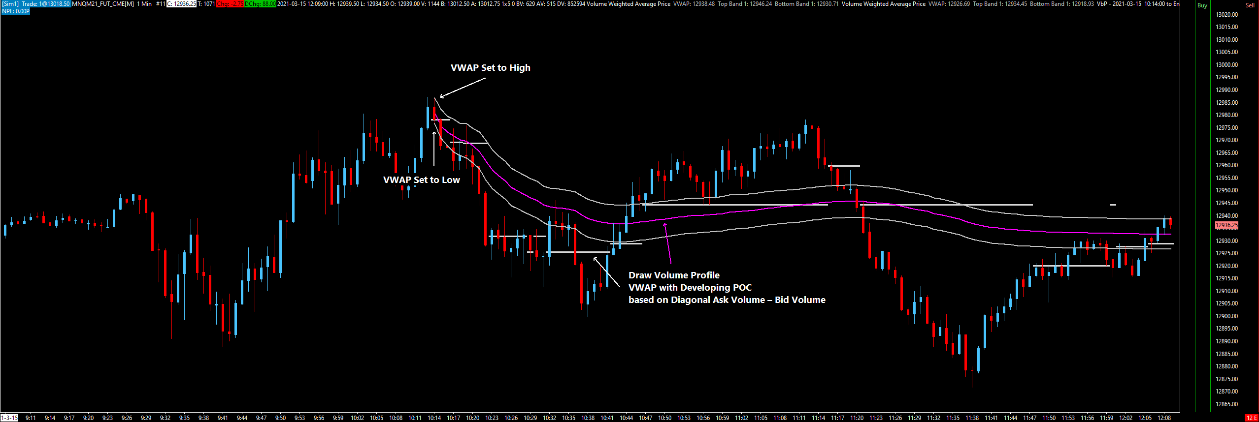 Your indicator Volume By Price has "Calculate Mean Price and Standard Deviation Bands" and we can set it to Yes/No. It would be nice if we had more options, like: calculation Method, Band Offset, Input Data (High, Low, HL Avg) - and your indicator Volume Weighted Average Price does all that. That's why I said it would be nice to integrate them. Also the ability to make 1 VWAP Set to High and one set to Low. So combining them would create the perfect Volume Profile for me, so we can see everything with one shortcut. Nowadays, I set a shortcut to Draw Volume Profile and to clear all of them. I trade based on the VWAP and developing POC based on Diagonal Ask Volume – Bid Volume. So I am always changing the Draw Volume Profile start point. So it would be nice to see the VWAP set to High, VWAP set to Low, Normal VWAP and developing POC based on Diagonal Ask Volume – Bid Volume in one indicator (Like the picture uploaded). http://www.sierrachart.com/image.php?Image=1615833297743.png  |