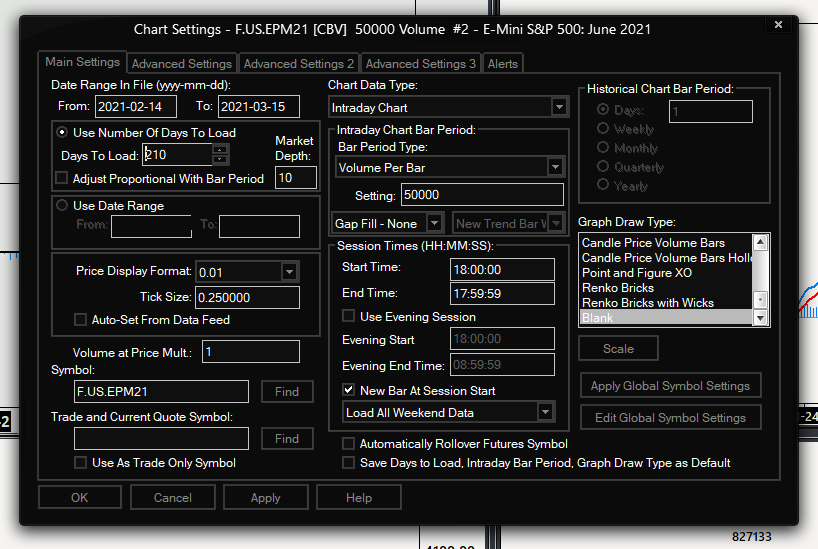 Hello, after rolling over last friday I got missing days in all my Intraday charts in ES. No data from 2020/12/10 to 2021/2/15. I can't find an answer or thread that can help. I have CQG with AMP. I have already tried Delete and download but nothing happens. Can you help, please. Thank you, Matteo I have attached a few screenshots of my charts and one of the Chart settings. |