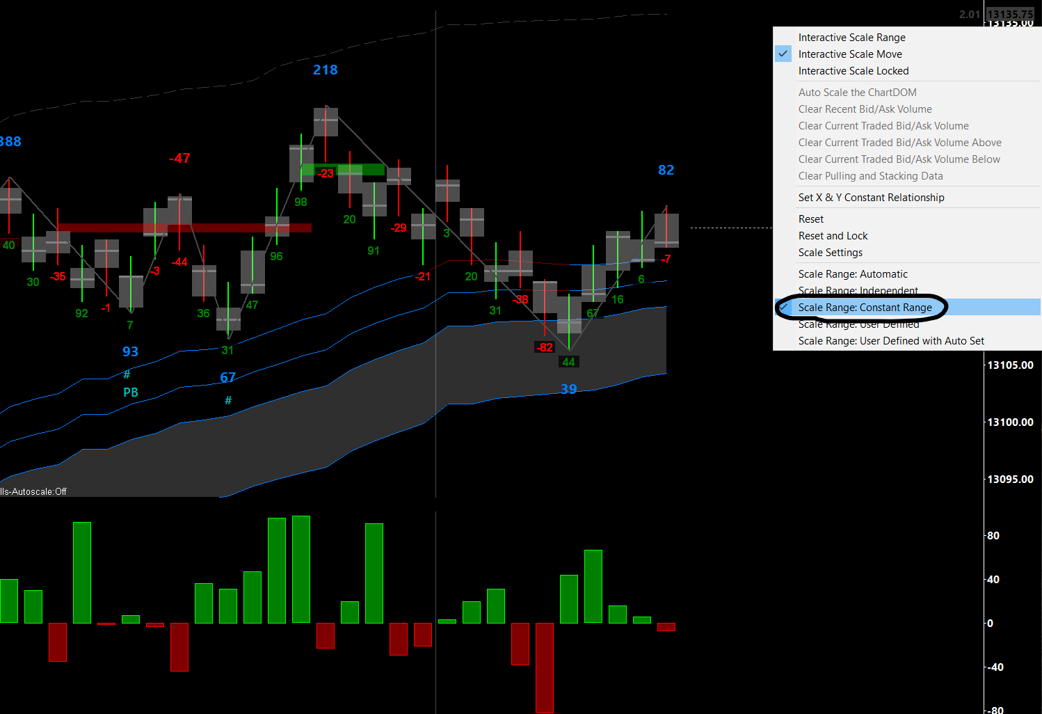 Hi there, For some reason any time I adjust something in my studies or refresh my charts the scale range changes from 'Constant Range' to 'Automatic' scale I would like to keep this particular chart (please see image) in the 'Constant Range' scale Is there a way to make 'Constant Range' scale default for this chart so that it does not keep reverting back to 'Automatic' scale? Thanks very much for your time. Josh |