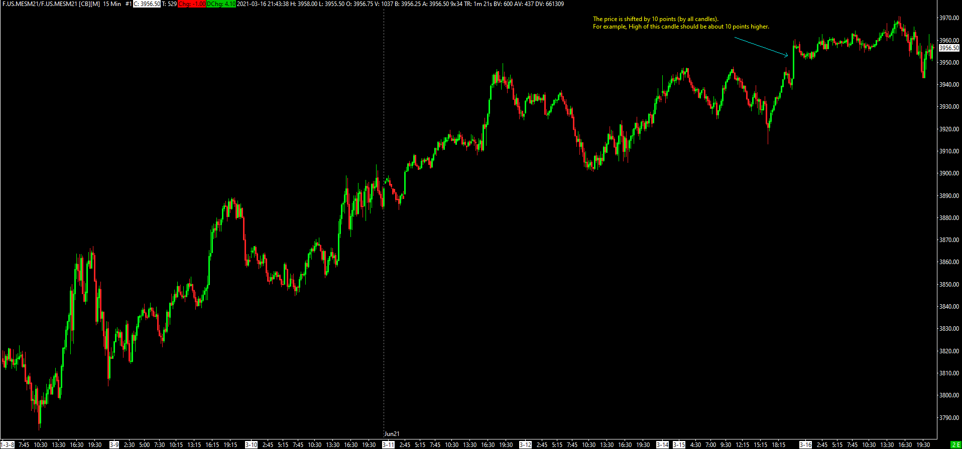 We think you are comparing to the wrong contract.  Here is what we see for that particular bar in image 1615994165684 on our system: http://www.sierrachart.com/image.php?Image=1615998190932.png Which matches exactly what you have in your image. And the attached image shows the information from the CME Group for the same bar for the same MESM21 contract. Which matches exactly to your data and our data. So all 3 are showing the exact same information. For the most reliable, advanced, and zero cost futures order routing, use the Teton service:  Sierra Chart Teton Futures Order Routing  |