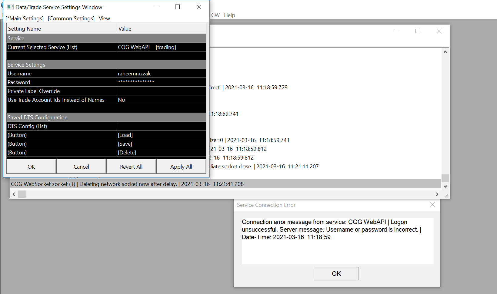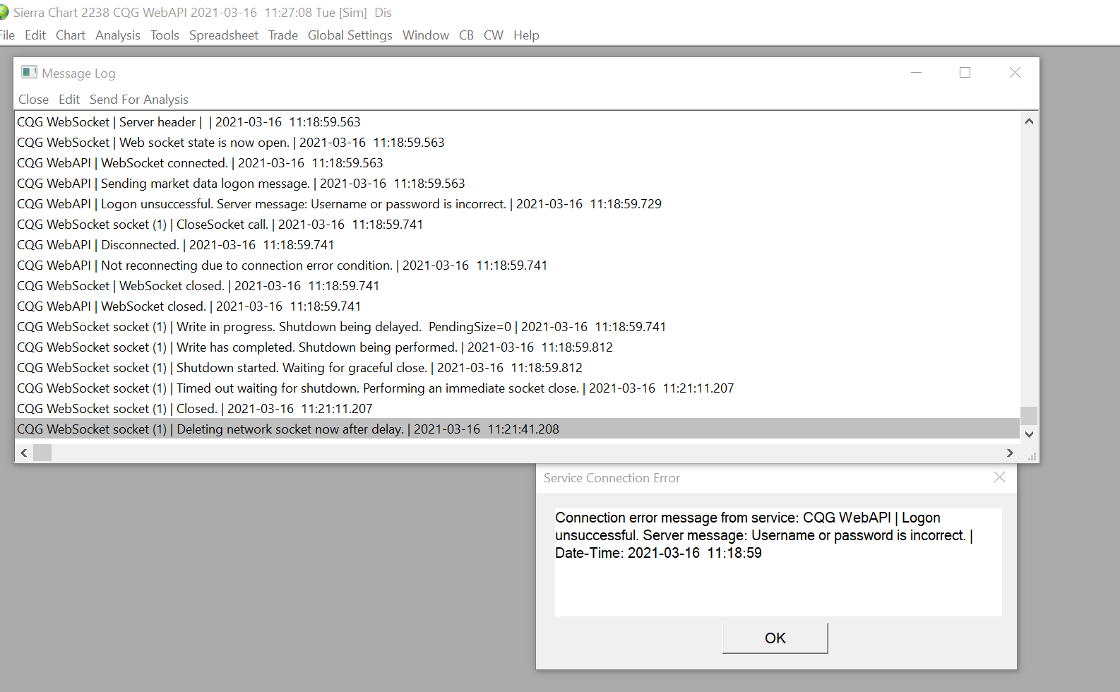 I just opened my account and when I try to connect I get a Service connection Error. I try to change the service settings, but that didn't work as well. Not sure how can I revert the service settings back to what it was. I've attached the screenshots of the error Log Reading Internal Order ID file. | 2021-03-16 11:18:52.228 Reading Trade Orders file. | 2021-03-16 11:18:52.341 Reading Trade Positions file. | 2021-03-16 11:18:52.341 Reading Trade Account Data files. | 2021-03-16 11:18:52.342 UDPListener (1508). Port 22904 | Listening on UDP port 22904. | 2021-03-16 11:18:52.371 Software version: 2238 64-bit | 2021-03-16 11:18:52.372 Primary Thread ID: 21768 | 2021-03-16 11:18:52.372 Usage end date: 2021-03-31 | 2021-03-16 11:18:52.372 Enabled for: Advanced Features 2. | 2021-03-16 11:18:52.372 Enabled for: Sierra Chart Historical Data Service. | 2021-03-16 11:18:52.372 Enabled for: Delayed Denali Exchange Data Feed. | 2021-03-16 11:18:52.372 Allow Support for Sierra Chart Data Feeds is enabled. | 2021-03-16 11:18:52.372 Current selected Data/Trading service: CQG WebAPI | 2021-03-16 11:18:52.372 Custom symbol settings values: enabled | 2021-03-16 11:18:52.372 Chart Update Interval: 10 | 2021-03-16 11:18:52.372 Intraday Data Storage Time Unit: 0 | 2021-03-16 11:18:52.372 Time Zone: -07:00:00 (PST-08PDT+01,M3.2.0/02:00,M11.1.0/02:00) | 2021-03-16 11:18:52.372 2021-03-16 18:18:52 Local computer time in UTC | 2021-03-16 11:18:52.372 2021-03-16 11:18:52 Local computer time in SC Time Zone | 2021-03-16 11:18:52.372 2021-03-16 18:18:51 Server time in UTC | 2021-03-16 11:18:52.372 Local computer UTC time and Server UTC time difference: 0 seconds. | 2021-03-16 11:18:52.372 Program path: C:\SierraChart\ | 2021-03-16 11:18:52.372 Data Files path: C:\SierraChart\Data\ | 2021-03-16 11:18:52.372 OS Version Number: 10.0 | 2021-03-16 11:18:52.373 Locale Setting: C | 2021-03-16 11:18:52.373 DLLs: UserContributedStudies_64.dll | 2021-03-16 11:18:52.373 Allowed protected custom studies: | 2021-03-16 11:18:52.373 Created the DTC Protocol server. | 2021-03-16 11:18:52.396 DTC Protocol Server listening on port 11099. | 2021-03-16 11:18:52.397 Created the DTC Protocol historical data server. | 2021-03-16 11:18:52.397 HD Server Manager | Listening on port 11098 | 2021-03-16 11:18:52.399 Checking for new symbol settings. Requested symbol settings MD5 for service code cqg. Request ID: 1. | 2021-03-16 11:18:52.399 HTTPS connection ID:1 to login.sierrachart.com:443 for request ID:1 (1) | Shutdown started. Waiting for graceful close. | 2021-03-16 11:18:52.431 HTTPS connection ID:1 to login.sierrachart.com:443 for request ID:1 (1) | Socket gracefully closed by remote side. | 2021-03-16 11:18:52.592 HTTPS connection ID:1 to login.sierrachart.com:443 for request ID:1 (1) | Closed. | 2021-03-16 11:18:52.592 Received 5 login tokens. | 2021-03-16 11:18:52.950 Symbol settings MD5 received. Request ID: 1. | 2021-03-16 11:18:53.233 Symbol settings are up-to-date for cqg. | 2021-03-16 11:18:53.233 CQG WebAPI | Connecting to server api.cqg.com | 2021-03-16 11:18:59.090 CQG WebSocket | Connecting to WebSocket server api.cqg.com:443 | 2021-03-16 11:18:59.090 CQG WebSocket socket (1) | Creating socket. Using TLS 1.2. | 2021-03-16 11:18:59.270 CQG WebSocket socket (1) | New receive buffer size: 5242880 | 2021-03-16 11:18:59.270 CQG WebSocket socket (1) | Connecting to IP: 208.48.16.35. | 2021-03-16 11:18:59.270 CQG WebSocket | Opening WebSocket. | 2021-03-16 11:18:59.342 CQG WebSocket | Sending WebSocket handshake. | 2021-03-16 11:18:59.342 CQG WebSocket | Server header | HTTP/1.1 101 Switching Protocols | 2021-03-16 11:18:59.563 CQG WebSocket | Server header | Connection: upgrade | 2021-03-16 11:18:59.563 CQG WebSocket | Server header | Sec-WebSocket-Accept: B7rZDAuuVj32HCyAkq09ncDGGDw= | 2021-03-16 11:18:59.563 CQG WebSocket | Server header | Server: WebSocket++/0.7.0 | 2021-03-16 11:18:59.563 CQG WebSocket | Server header | Upgrade: websocket | 2021-03-16 11:18:59.563 CQG WebSocket | Server header | | 2021-03-16 11:18:59.563 CQG WebSocket | Web socket state is now open. | 2021-03-16 11:18:59.563 CQG WebAPI | WebSocket connected. | 2021-03-16 11:18:59.563 CQG WebAPI | Sending market data logon message. | 2021-03-16 11:18:59.563 CQG WebAPI | Logon unsuccessful. Server message: Username or password is incorrect. | 2021-03-16 11:18:59.729 CQG WebSocket socket (1) | CloseSocket call. | 2021-03-16 11:18:59.741 CQG WebAPI | Disconnected. | 2021-03-16 11:18:59.741 CQG WebAPI | Not reconnecting due to connection error condition. | 2021-03-16 11:18:59.741 CQG WebSocket | WebSocket closed. | 2021-03-16 11:18:59.741 CQG WebAPI | WebSocket closed. | 2021-03-16 11:18:59.741 CQG WebSocket socket (1) | Write in progress. Shutdown being delayed. PendingSize=0 | 2021-03-16 11:18:59.741 CQG WebSocket socket (1) | Write has completed. Shutdown being performed. | 2021-03-16 11:18:59.812 CQG WebSocket socket (1) | Shutdown started. Waiting for graceful close. | 2021-03-16 11:18:59.812 CQG WebSocket socket (1) | Timed out waiting for shutdown. Performing an immediate socket close. | 2021-03-16 11:21:11.207 CQG WebSocket socket (1) | Closed. | 2021-03-16 11:21:11.207 CQG WebSocket socket (1) | Deleting network socket now after delay. | 2021-03-16 11:21:41.208 Date Time Of Last Edit: 2021-03-16 18:32:52