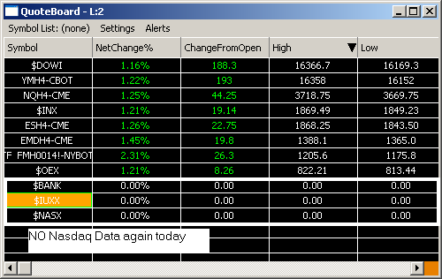 I just added the Nasdaq exchange to my list of enabled exchanges this morning and I am NOT getting any data (Real Time or Historical) for the following symbols, $Bank, $IUXX, $NASX. I followed your instructions as per update symbols list, disconnect, reconnect etc and still no data. I haven't checked any of the other Nasdaq symbols apart from the 3 listed above... Thx |
