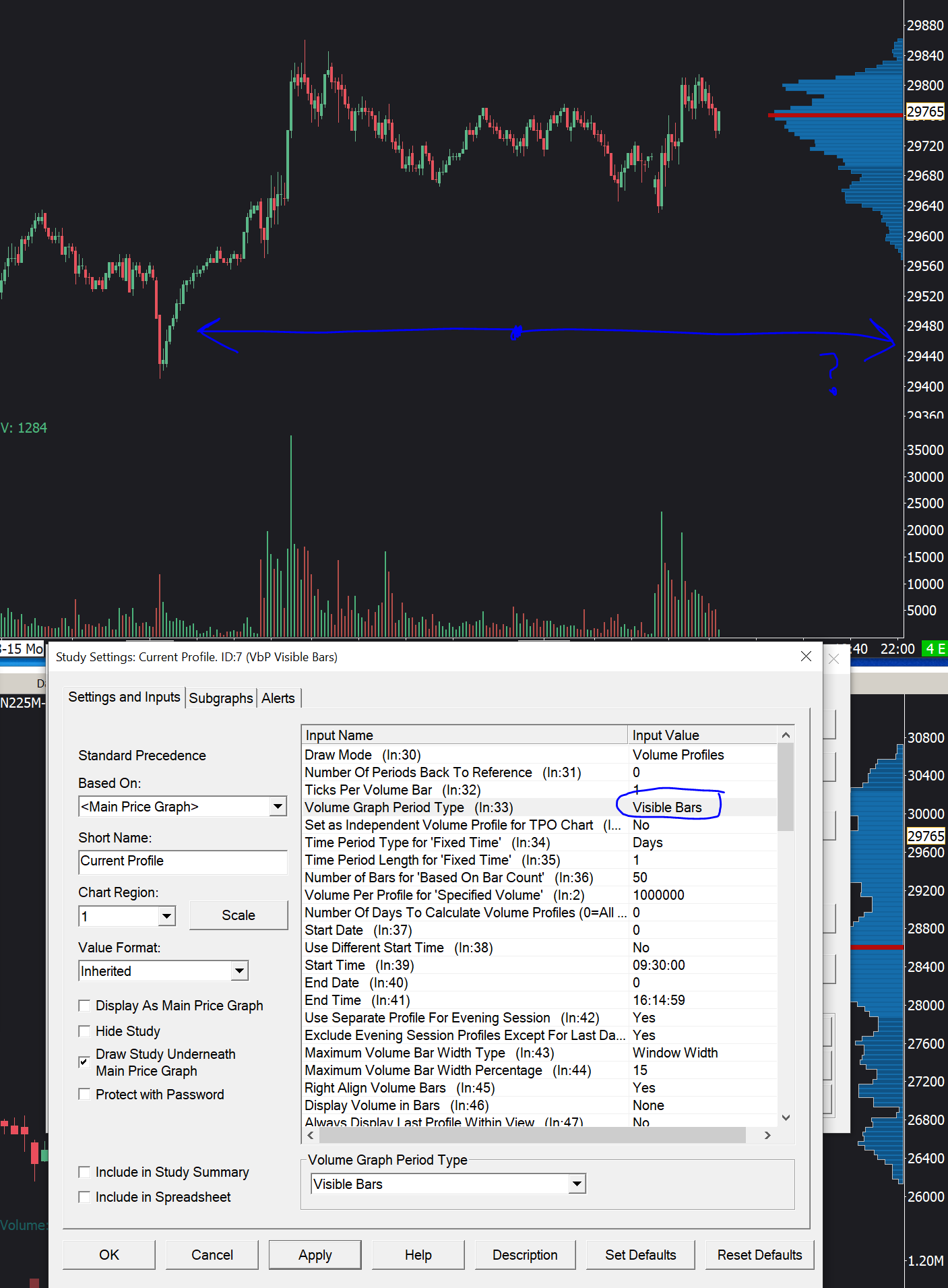 The problem here is that the "Exclude Evening data" option is set to Yes. Call me crazy, but when the profile is set to "Visible Bars" I would think that takes precedence over an option about excluding certain sessions. However, I can see how it may be useful. Nonetheless, it is a bit confusing. |