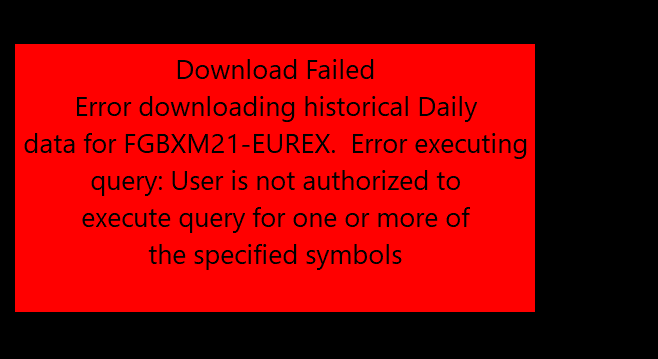 I first noticed it on continuous contracts but the point of my message is that even without the option activated, the historical daily chart is missing recent data. Then obviously it won't work with continuous contract option activated either. http://www.sierrachart.com/image.php?Image=1616163811398.png HD Request # 2 | Error downloading historical Daily data for FGBXM21-EUREX. Error executing query: User is not authorized to execute query for one or more of the specified symbols | 2021-03-19 09:21:51.685 |