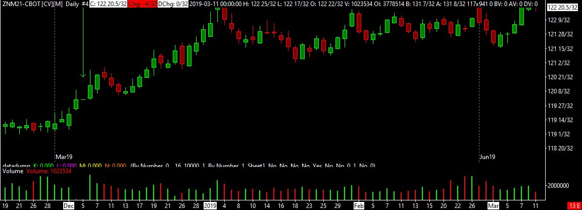 I just switched to the Denali data feed and noticed at least one field with missing data on a historical (daily) chart and its associated spreadsheet study. The security is 10Yr Treasury Note futures (ZN) with volume-based rollover setting and the date is question is December 5 2018 - four days after rollover. The chart and spreadsheet both show very low, identical volume for both Dec. 4 and 5 2018, and an open, high, low, and closing price of 120-0.5/32 on December 5, suggesting no range or change throughout the session. See attached screenshot or view chart here - http://www.sierrachart.com/image.php?Image=1616271616173.png December 4 and 5 were a Tuesday and Wednesday and neither day was a market holiday. Any help fixing this would be very much appreciated. |