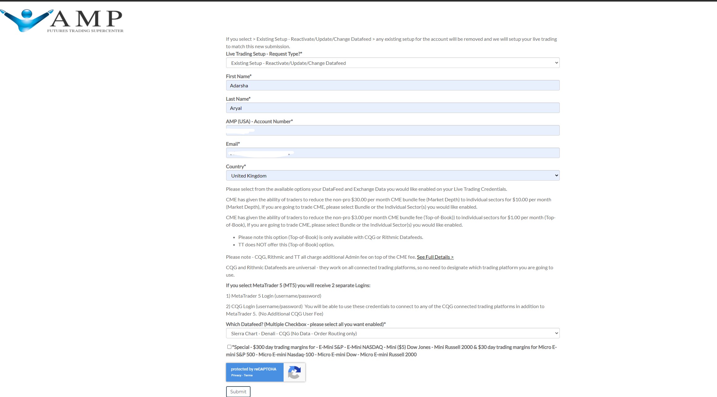 The reason why you need a futures trading account is so you can qualify for the Non-Professional CME Group exchange fees. Otherwise, you would have to pay the much higher priced Professional fees. Refer to the following for more information: Real-Time Exchange Data Feeds Available From Sierra Chart: Understanding and Accessing Data From the CME, CBOT, NYMEX, COMEX Exchanges We also need to know what Trading Service AMP has you setup to use. It would be one of either CQG, Rithmic, or TT. If you do not know, then you really need to find out and let us know. Again, this is so you can pay the Non-Professional rates, as we validate your account electronically when you connect to it through the software. Once we have the above information, then we will give you all the instructions to get connected. For the most reliable, advanced, and zero cost futures order routing, use the Teton service: Sierra Chart Teton Futures Order Routing |