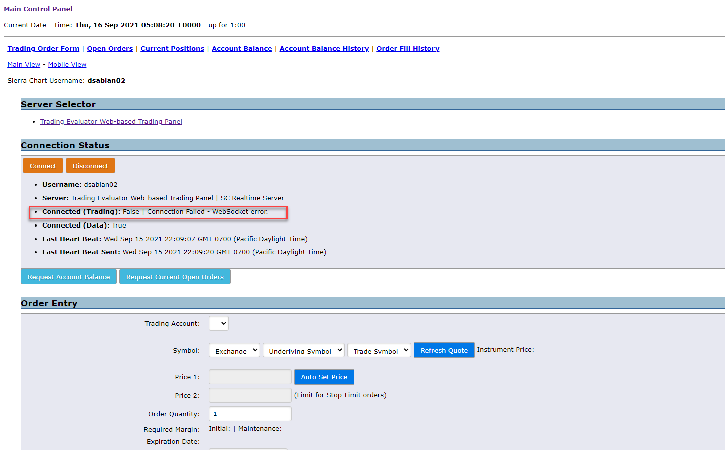 Thank you, I am able to connect and see my orders on the web-based evaluator now. But I am unable to cancel orders through my phone. Any idea what it might be? I tried refreshing, and re-connecting through my mobile device but the order still show up. Thanks again |