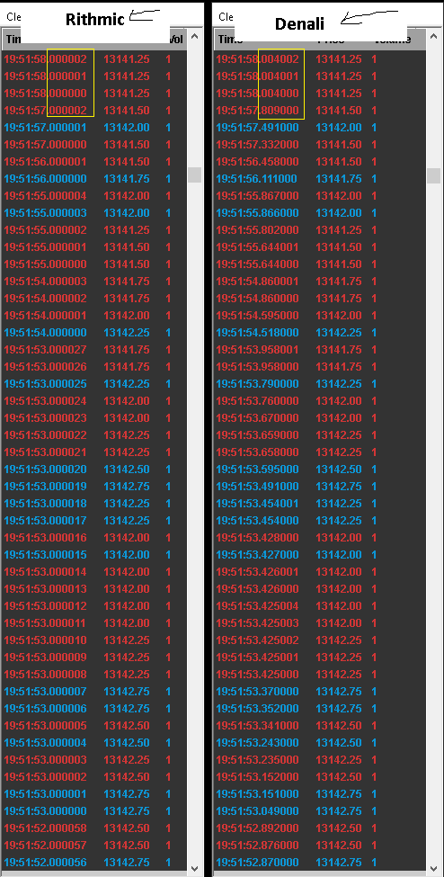 Hello. Today I decided to use Denali datafeed during my trading (DOM trading) and found that it is a bit slow to my filling. It is irrelevant to people who don`t use the DOM to trade but I found that there is a big difference between Rithmic and Denali. I run up two SIERRA applications and compared two datafeed with T&S and found that Rithmic is faster you can identify its visually. Both update intervals are 10ms. I tried to play with SC server settings but nothing helps. Could you recommend any solution to make it fast as Rithmic? Thank you a lot.