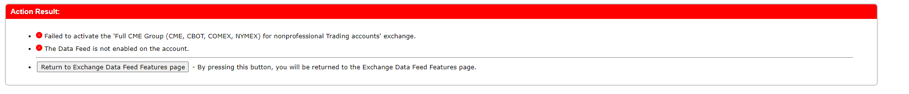 I am trying to enable the Denali Exchange Data Feed to my account but I am unable to. I have a balance in my account that is able to cover the exchange fee costs as well as the service package I have and I have signed all the agreements that are available for me to sign. When I go to activate the data feed I get this error message that is in the image attached. It says "Failed to activate the "Full CME Group (CME, CBOT, COMEX, NYMEX) for nonprofessional Trading accounts' exchange." It also says "The data feed is not enabled on the account." How am I able to set this up as I am following the setup instructions but they are not working? I have been fumbling around with Sierra Chart for weeks now. I do not know why it is this difficult. There is more than enough information but the problem is that there is too much information. I always have multiple tabs open that lead me in a circle trying to figure this out. Thanks. |