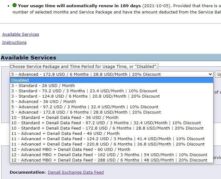 so for 1 month trial I have to accept the Advanced + Denali Data Feed = $46, even though I still have 188 days of Advanced package left? How do I convert my balance days to Advanced + Denali Data Feed? |