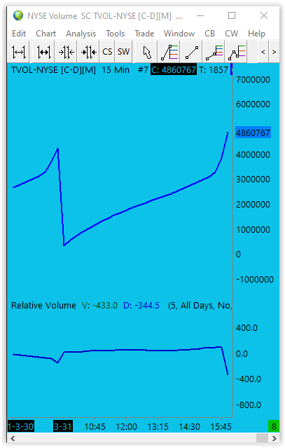 Hi there, An odd problem that I have I want to plot the difference in volume at each time of the day starting at 10am half hour after the open and compare it to the day previously in half hour intervals. Looks something like this in the tables screenshot. I read on a post that I can use relative volume tried that but it didn't turn out the way I needed it. I am taking this data off of Market Stats. I am using the NYSE Total Volume 24 hour as an example. The chart screencap uploaded shows the NYSE Total volume, then the subgraph is the Relative Volume Subgraph- Cum Volume Average Cum Volume Difference SG8. I want make that more usable, possibly just simply as a percentage graph/stat, right now the graph shows just flat line, and also this market stat is also the main chart, I don't know if I am using this Relative volume indicator the way that it's designed? % = (V(day2) - V(day1)) /total at 30min intervals. How can I achieve that? Cheers |