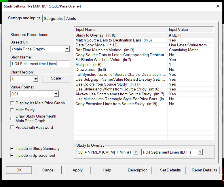 Study/Price Overlay I am trying to add oil price settlement time lines from a 1 minute chart to a 60 minute chart but the source chart (1Min) changes to a destination chart (60Min) time frame. I have "match source bars to destination bars" set to Yes but changing it to No still makes source bars chart (1Min) change to a 60 minute chart. I have used this previously for many years but now it doesn't work properly for me. What am I doing wrong? |