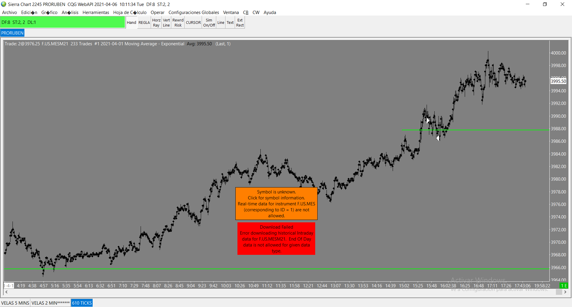 Cliente de AMP. He pagado por DENALI directamente a vosotros (el 1 de abril) y no estoy recibiendo los datos. Por favor darme una solución. Me salen estos 2 mensajes: Symbol is unknown click for symbol information. Real time data for instrument F US MES (corresponding to ID=1) are not allowed Download Failed Error downloading historical intraday data for FUS MESM21. End of day data is not allowed for given data type. No sé si el problema es que mi cuenta no está autorizada y la teneis que autorizar??? ya lo he probado todo y seguido todas las instrucciones y sigue sin funcionar... Date Time Of Last Edit: 2021-04-06 13:05:07